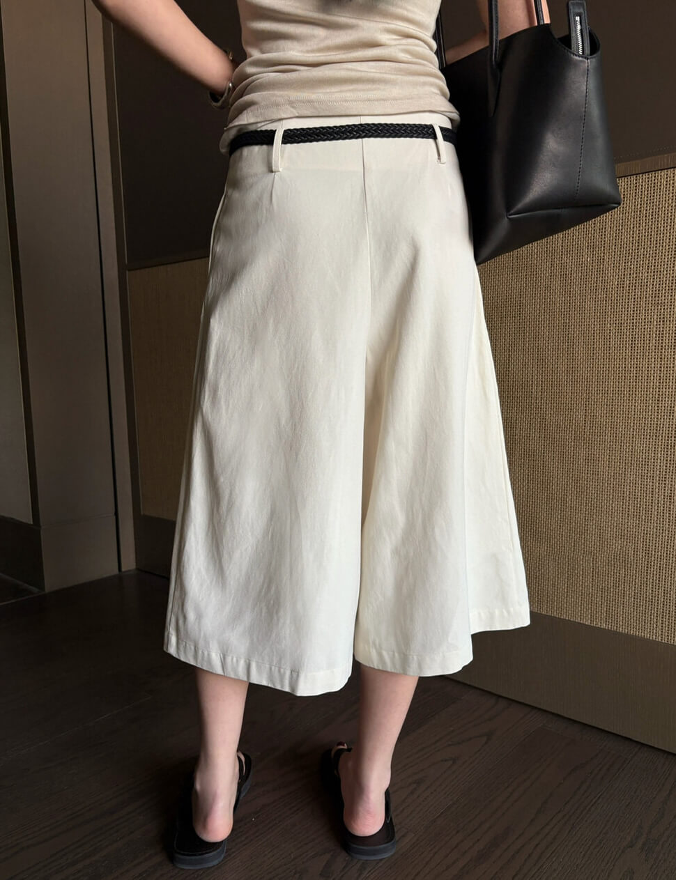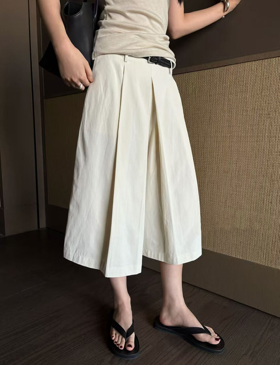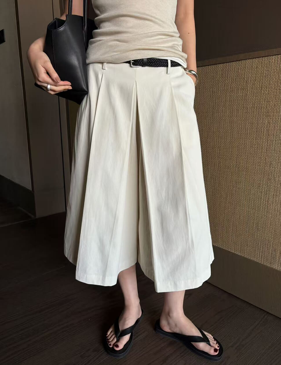 The long-shorts silhouette you'll reach for all season. These structured pleated wide-leg culottes combine effortless drape with refined tailoring — and come complete with a woven braided belt that adds instant polish without any extra effort. The deep front box pleats create graceful volume and movement, while the midi length keeps the look sophisticated and elongating.