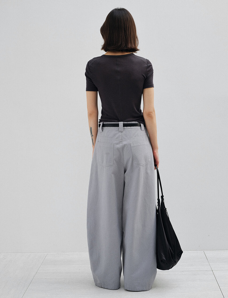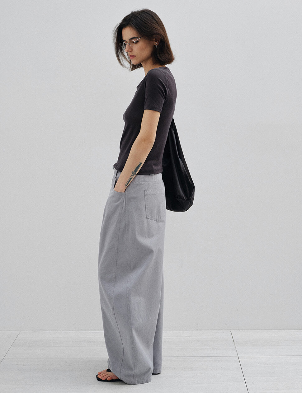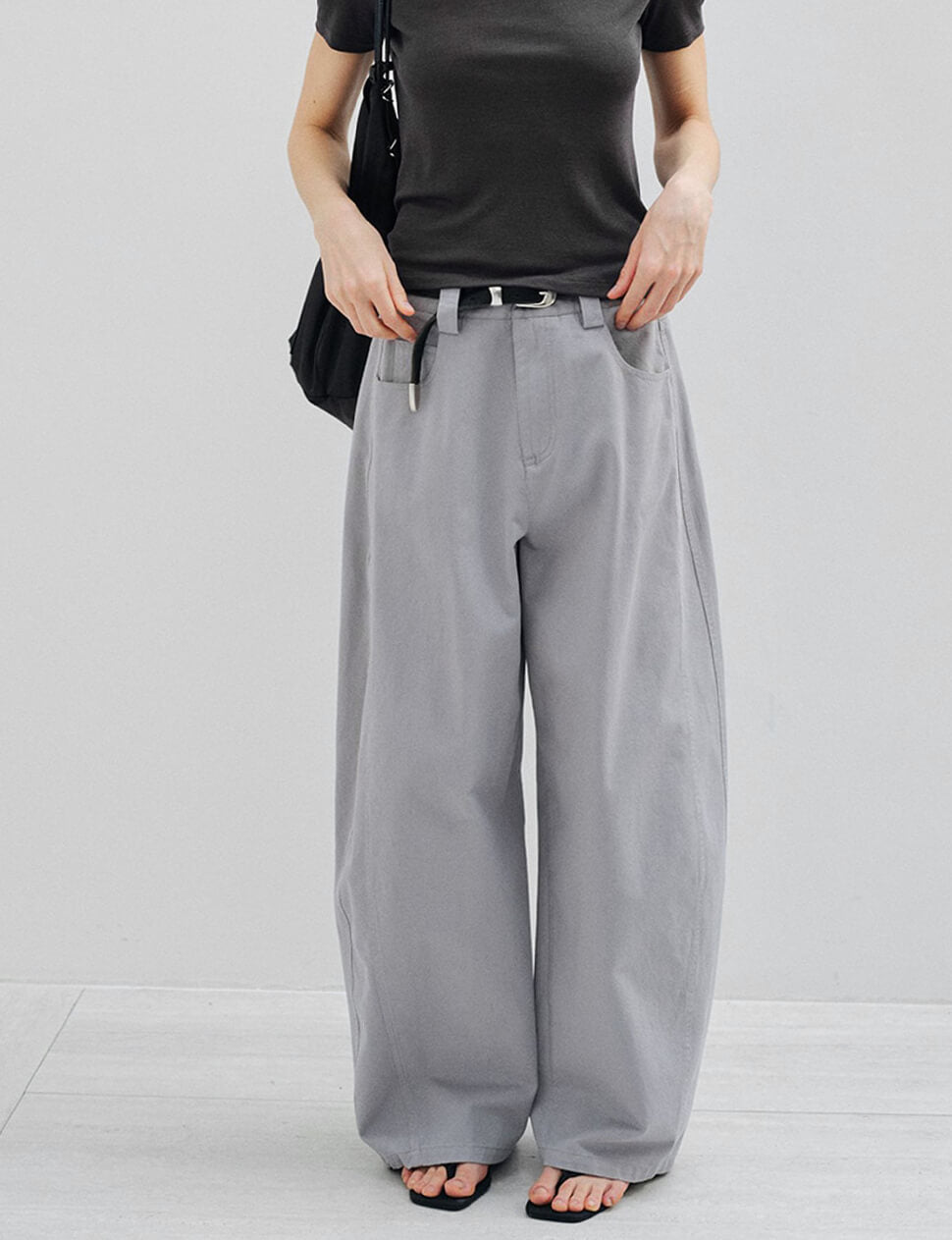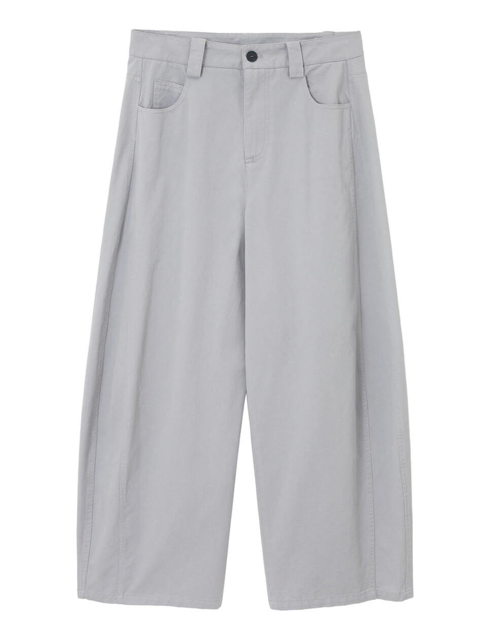 We produce on demand-once it's gone, it's gone.The trouser of the moment. These grey cotton barrel leg pants are cut in a wide, curved silhouette with a structured waist, five-pocket construction, and a single button closure. The curved seam through the leg does the visual work — everything else stays clean and simple.Wear them with a fitted tee and sandals or layer under an oversized shirt or bomber. The model wears a medium for a relaxed, easy fit.