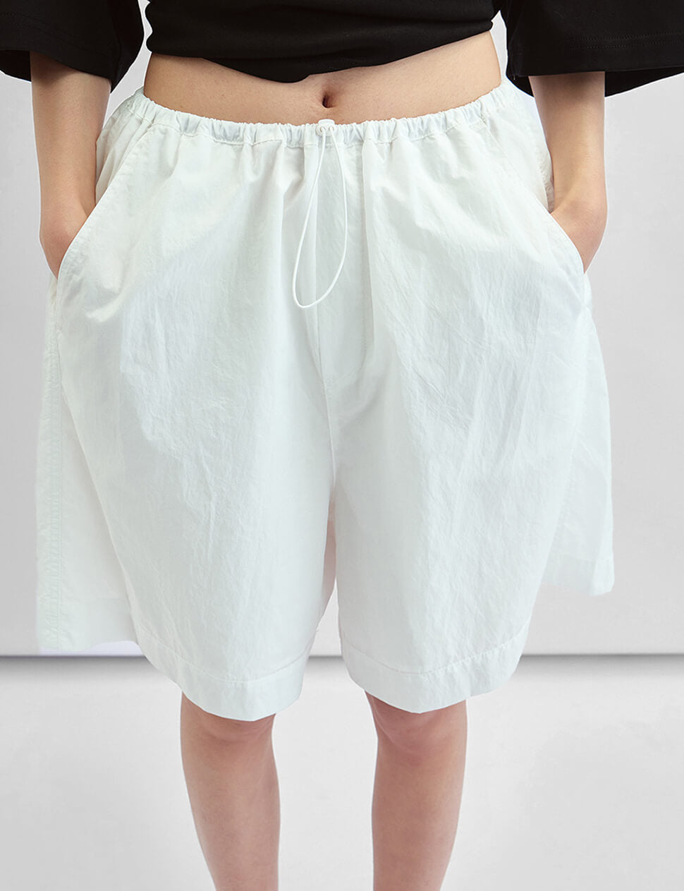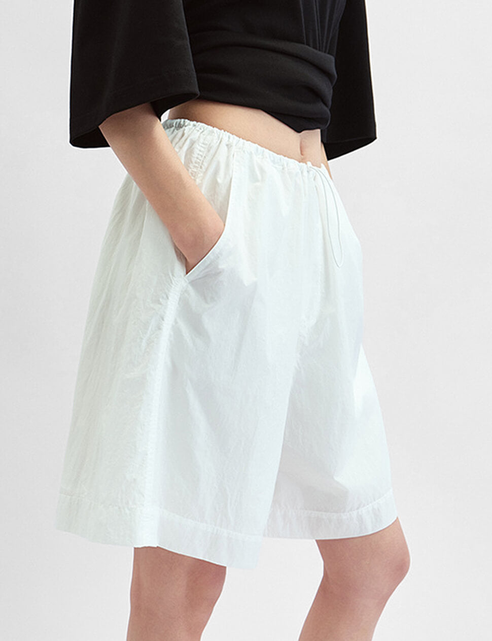 We produce on demand-once it's gone, it's gone.The shorts you reach for first. Cut from a lightweight nylon with a cotton-lined interior, the Relaxed Drawstring Shorts sit easy on the waist with an elastic and drawstring detail and fall into a wide, relaxed leg. Wear them with a fitted tank, an oversized tee, or nothing but a simple knit — they do the work either way. Available in white, brown ,and olive.