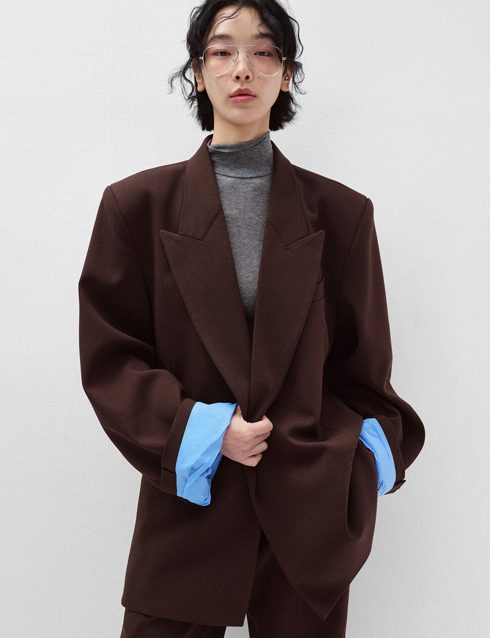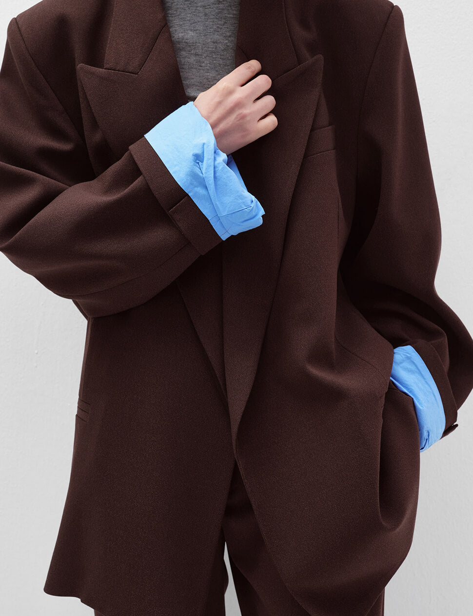 The color combination you didn't know you needed. Our Oversized Boyfriend Blazer in rich chocolate brown is finished with a surprise blue contrast lining that peeks through at the cuffs and lapel — a detail that elevates an already exceptional silhouette. Broad shoulders, deep pockets, and a longline cut that works as hard dressed up as it does thrown over jeans. The boyfriend blazer, reimagined.