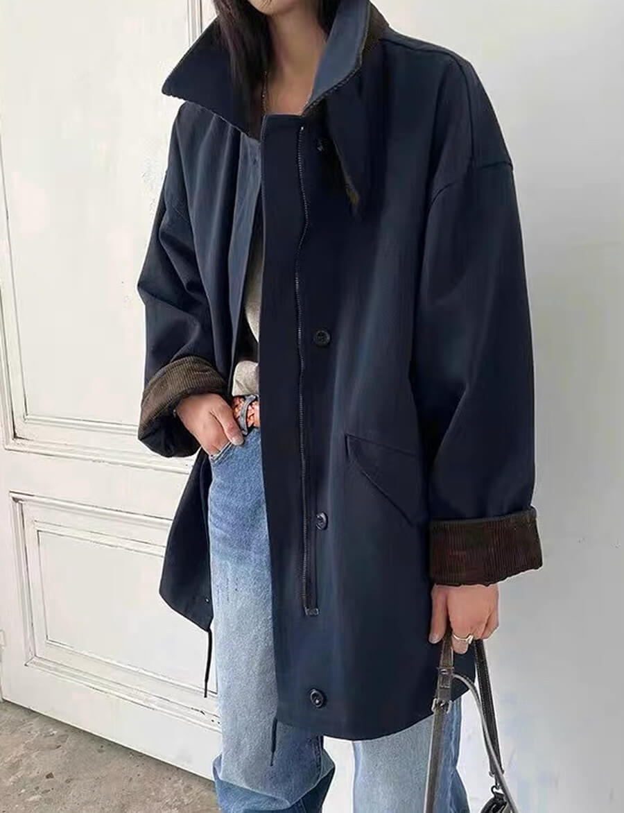 Navy oversized country jacket with brown corduroy contrast collar and sleeve cuff .Brand Pixie Market