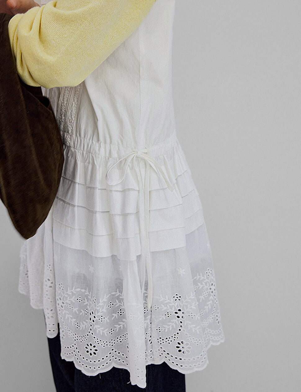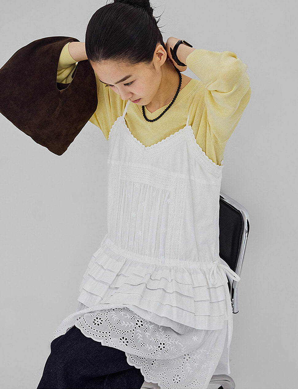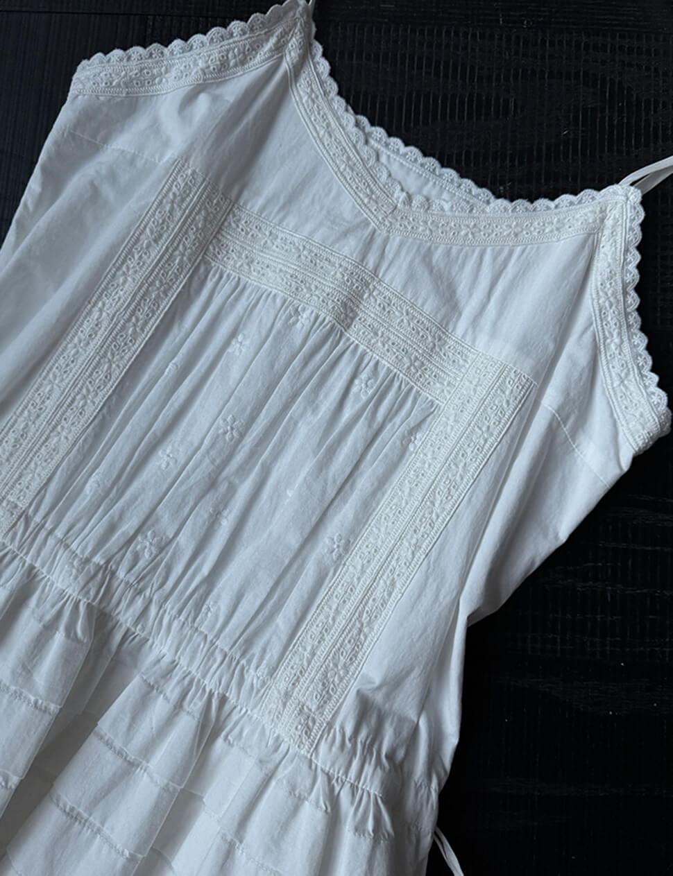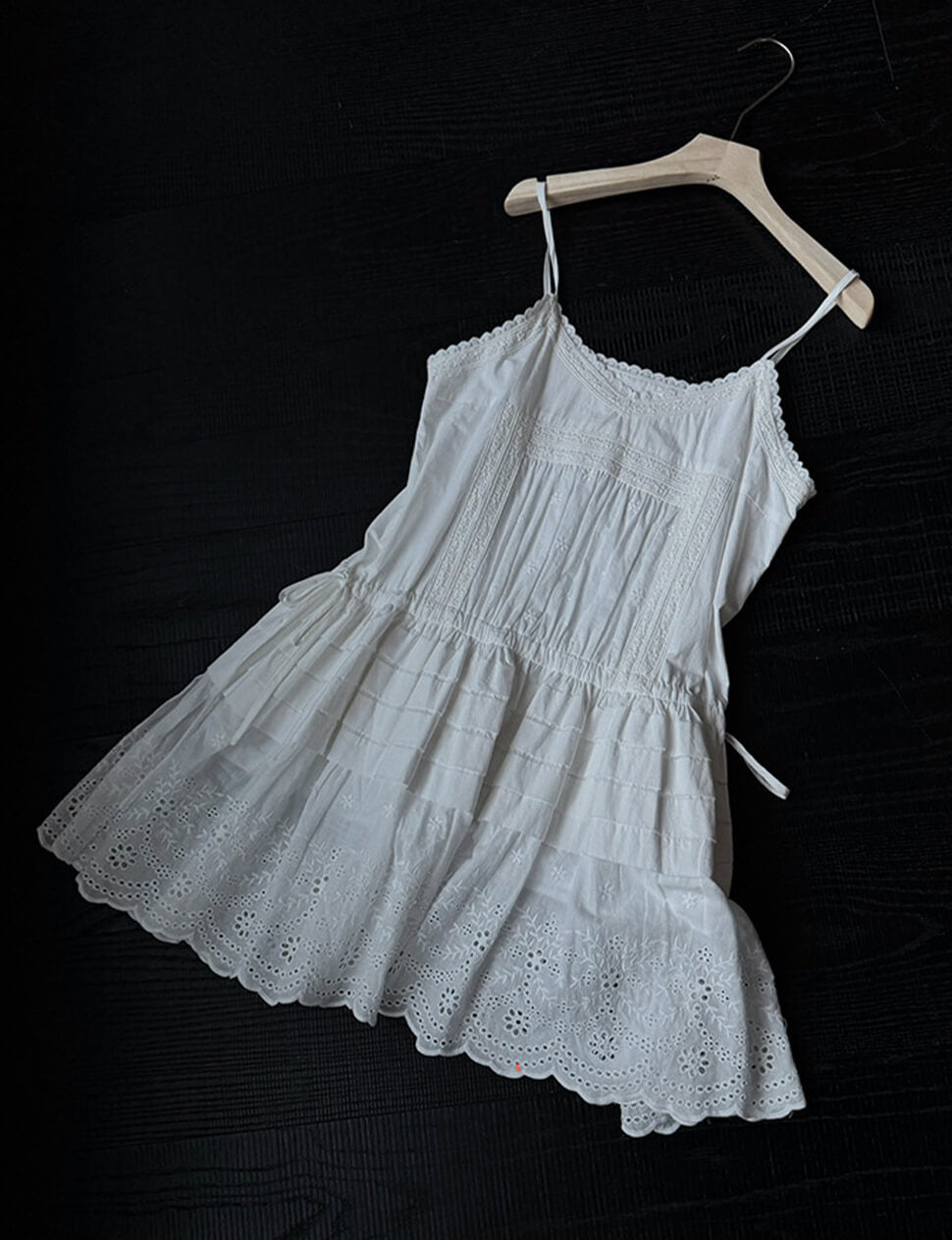 The dress that does double duty. Our White Eyelet Ruffle Mini Dress is cut from 100% cotton with a tiered ruffle body, delicate broderie anglaise hem and adjustable spaghetti straps — feminine without trying too hard. Wear it as a dress on its own, or lean into the layering trend and throw it over wide-leg jeans or tailored trousers for an effortlessly thrown-together look. A self-tie ribbon at the waist lets you define your silhouette or leave it loose.