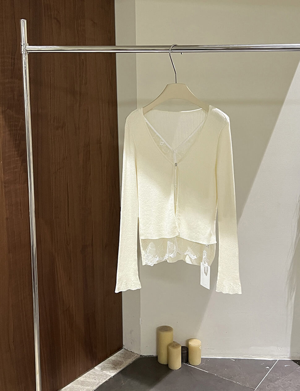 Knit cardigan with nine layered matching lace button layer.