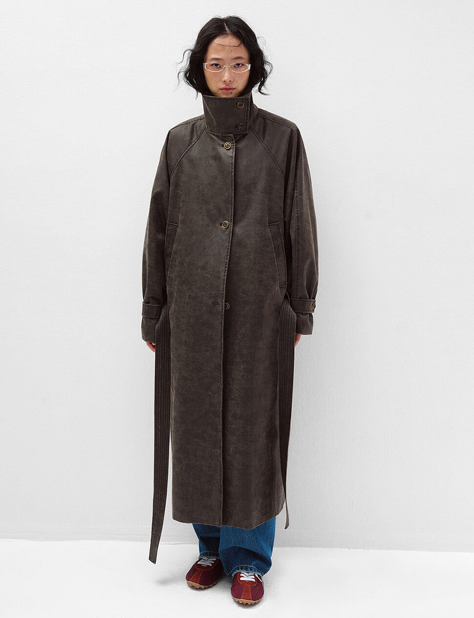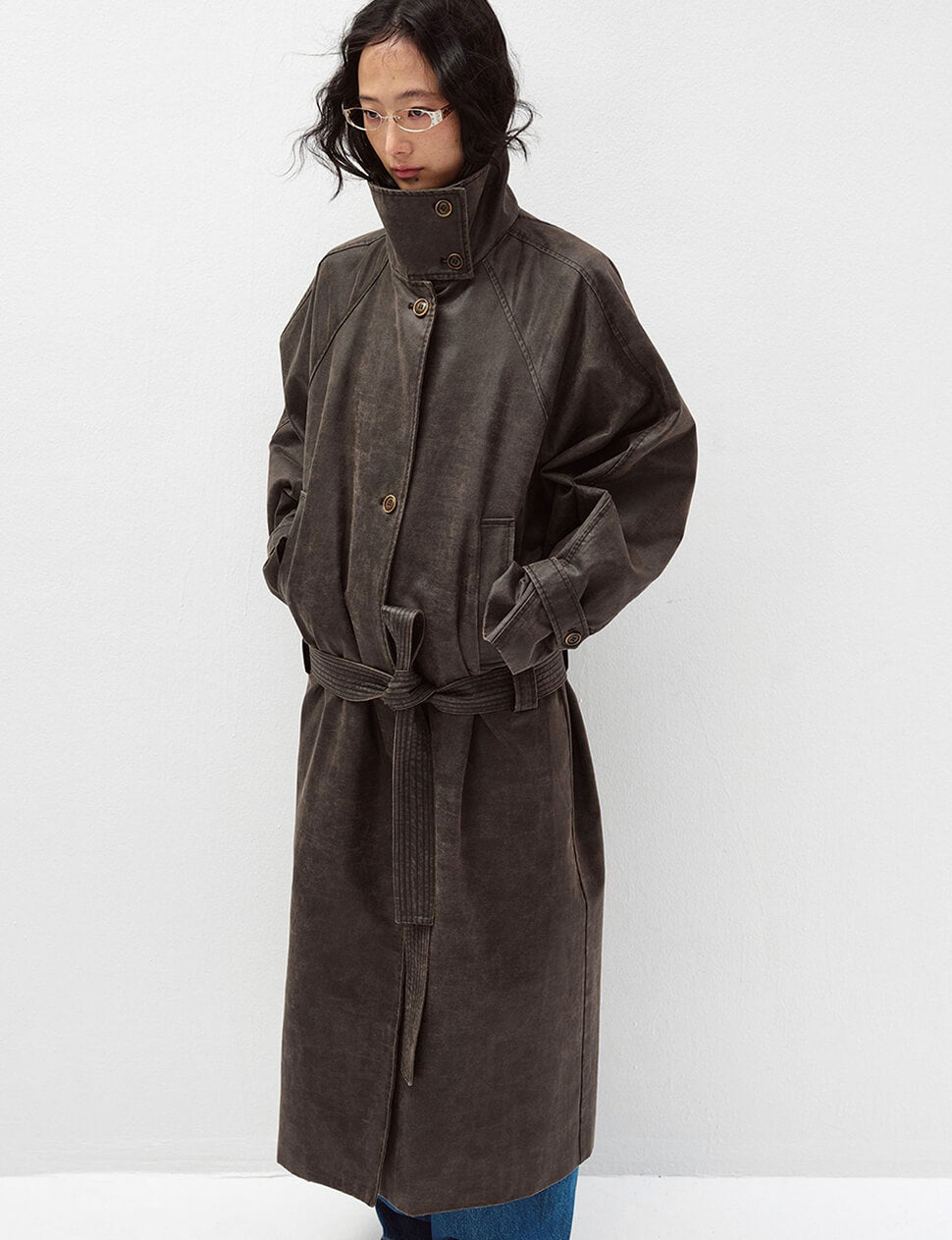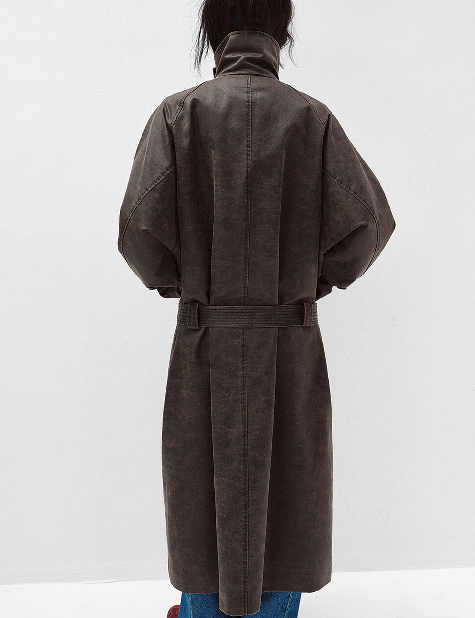 Our pre-order allows us to produce on demand, minimizing waste.Oversized Distressed Faux Leather Trench Coat