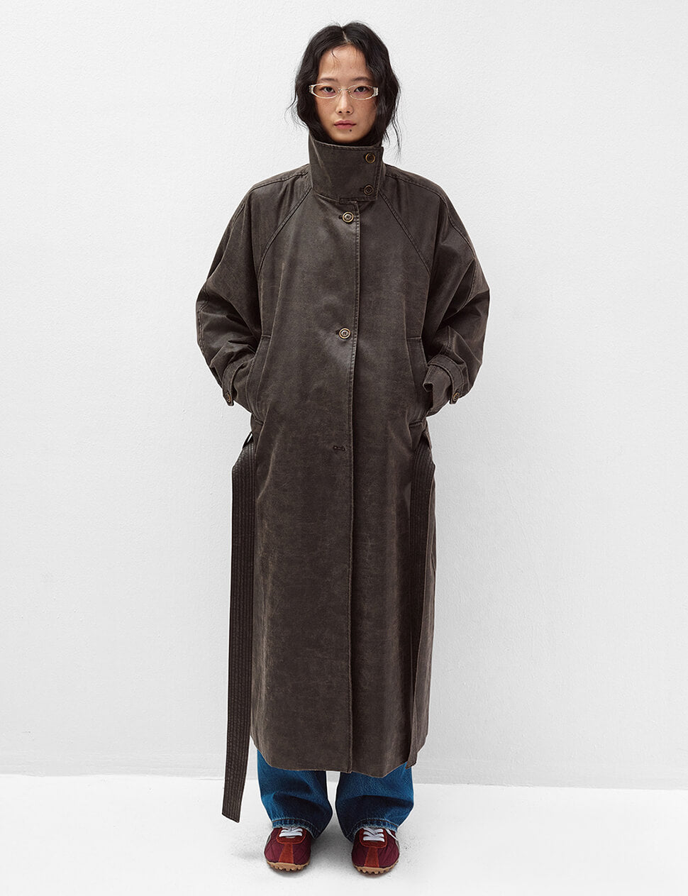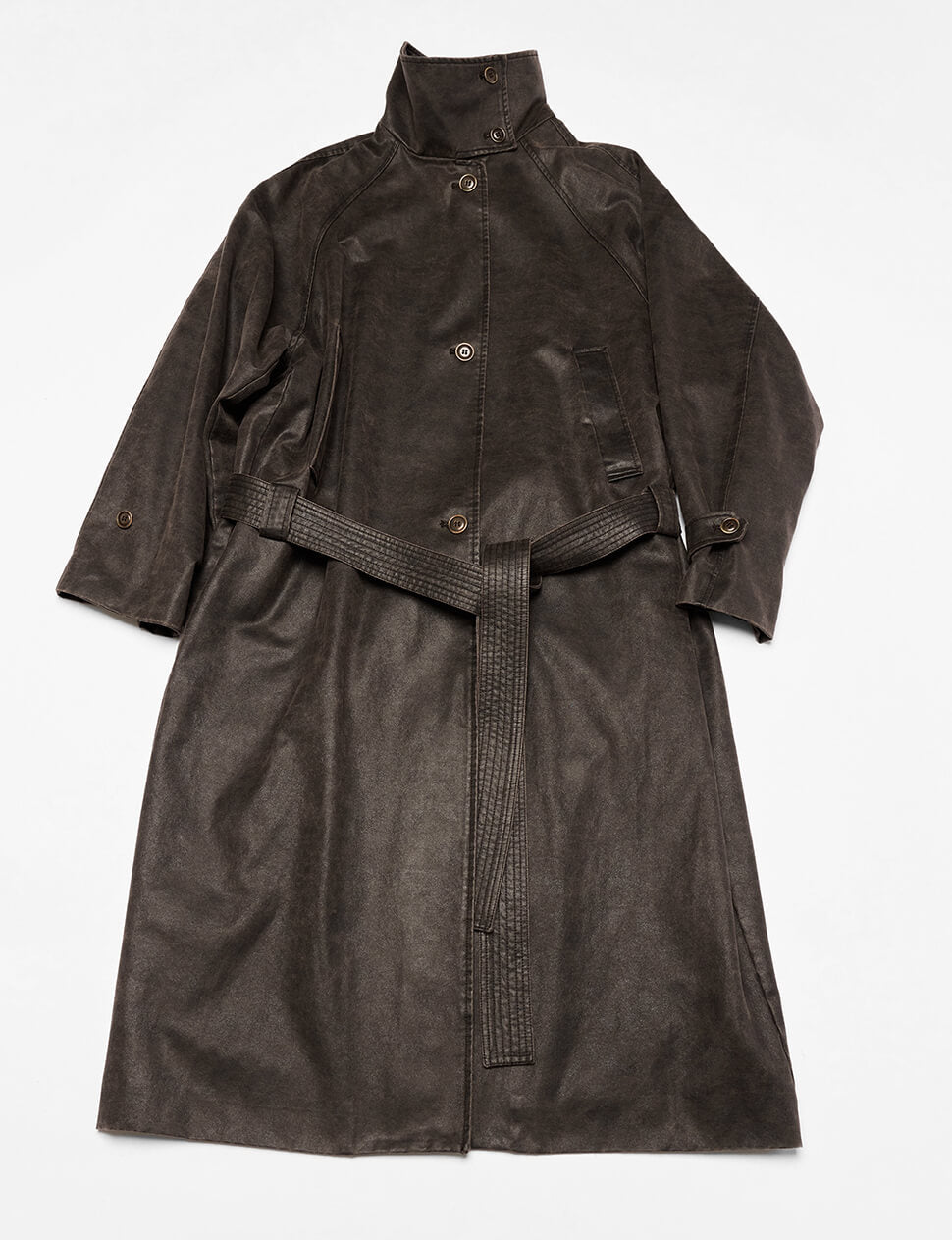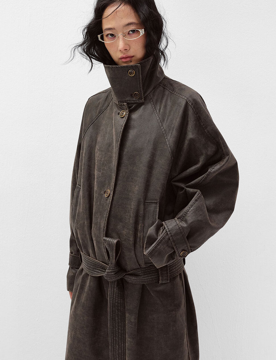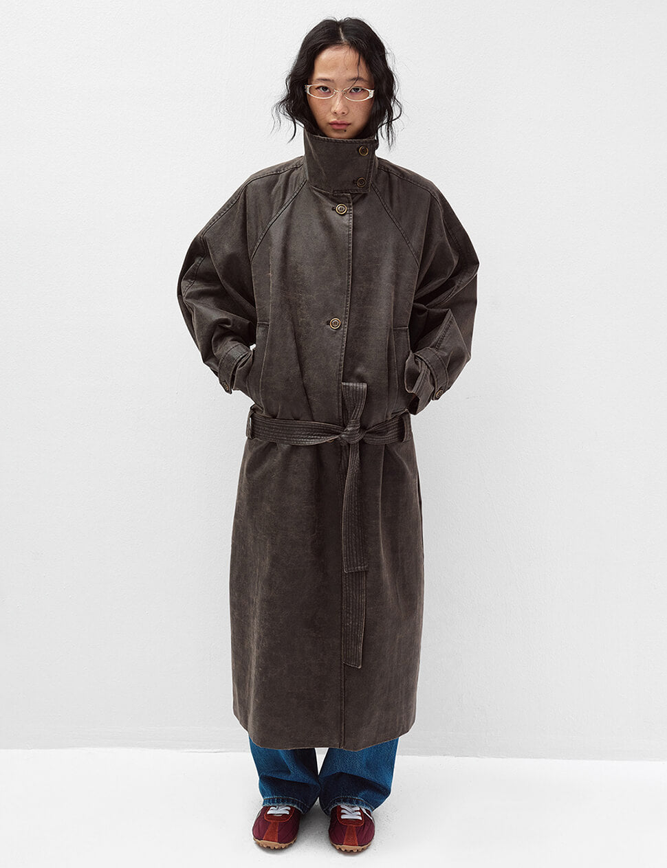 Our pre-order allows us to produce on demand, minimizing waste.Oversized Distressed Faux Leather Trench Coat