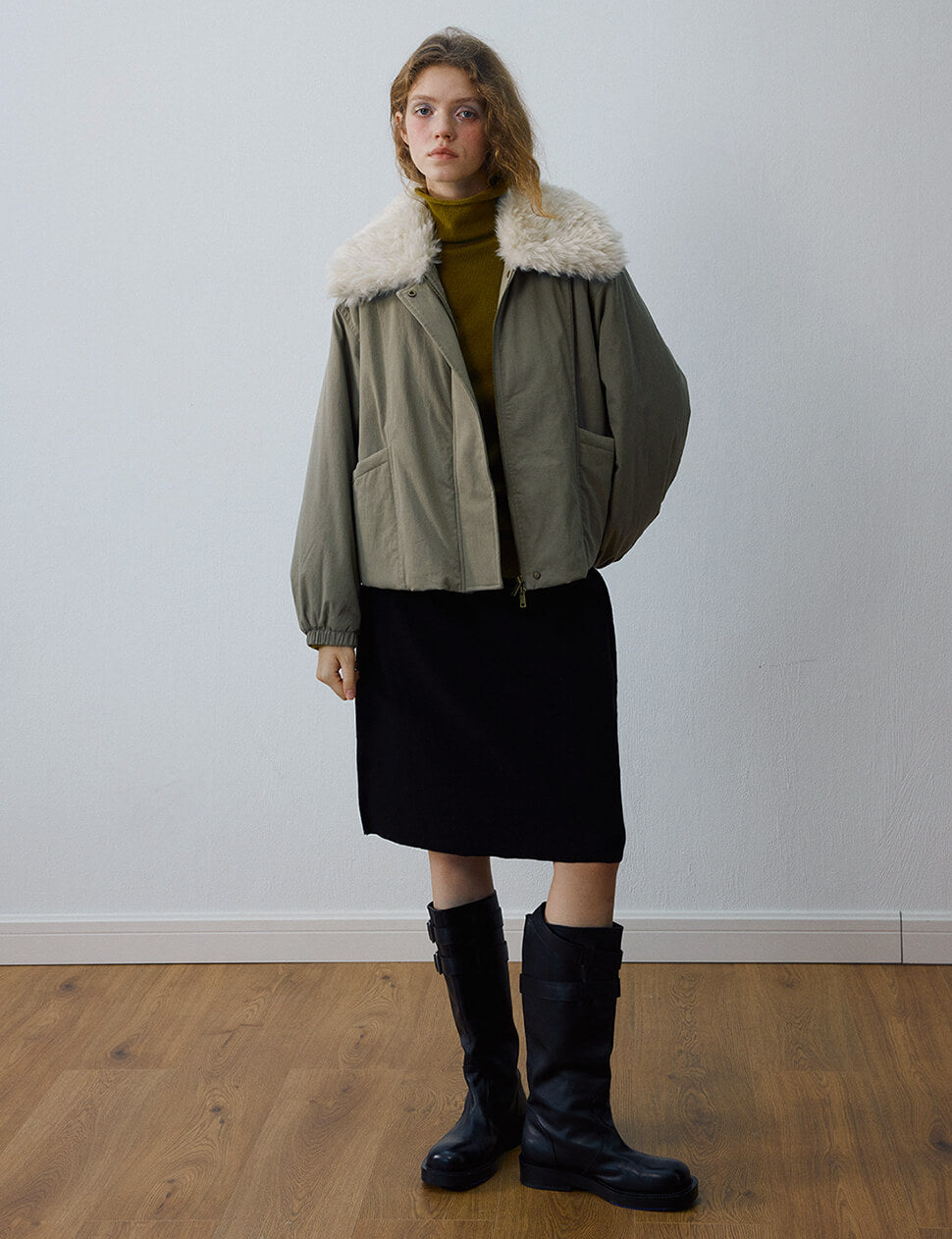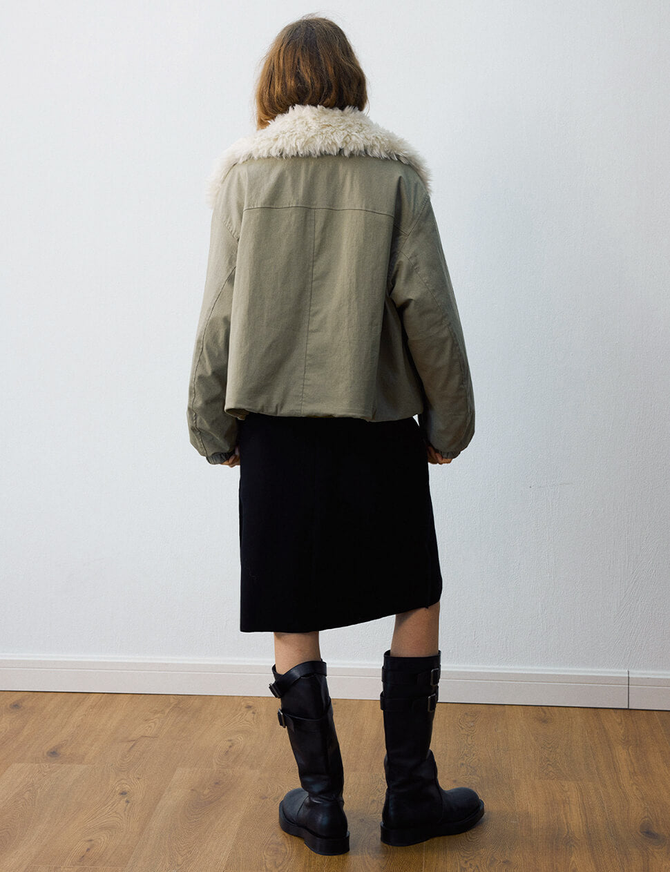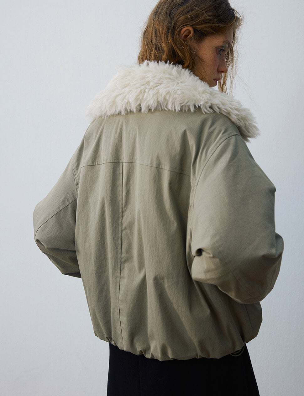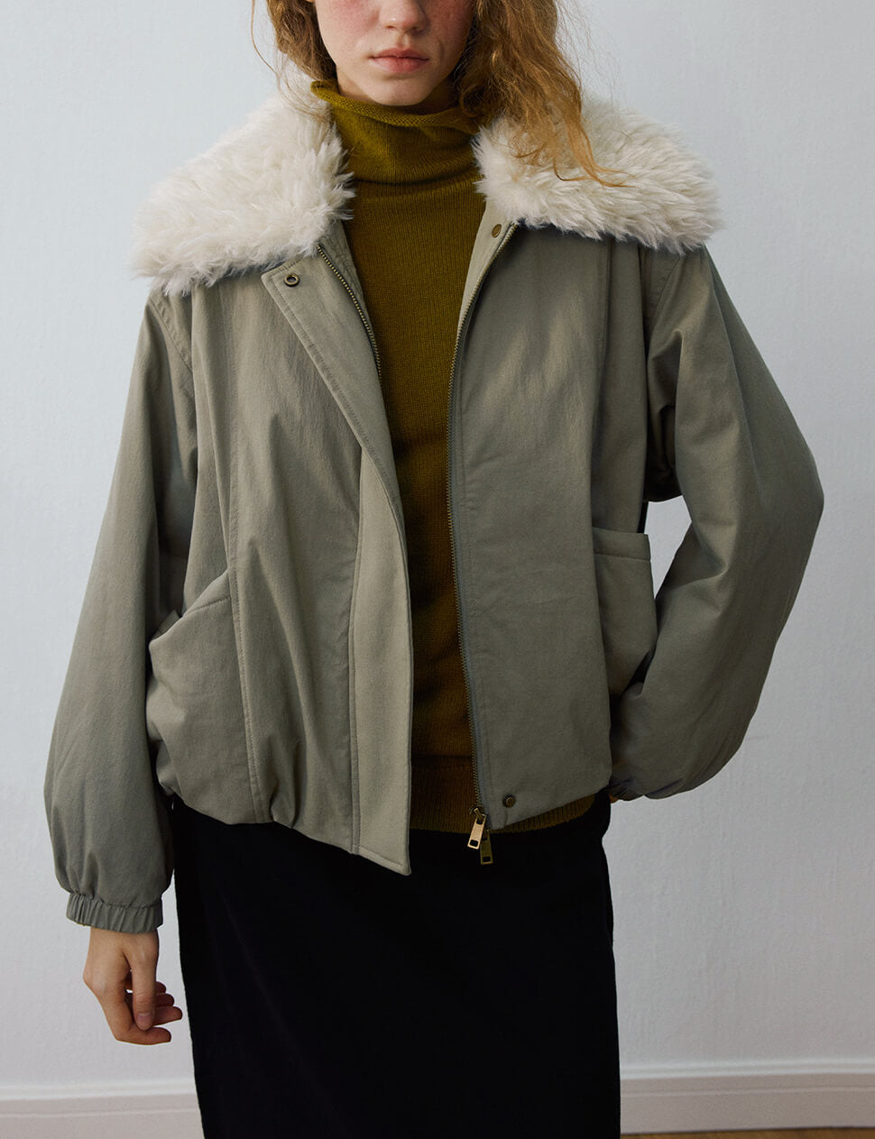 Our pre-order allows us to produce on demand, minimizing waste.Green crop bomber jacket with faux fur collar