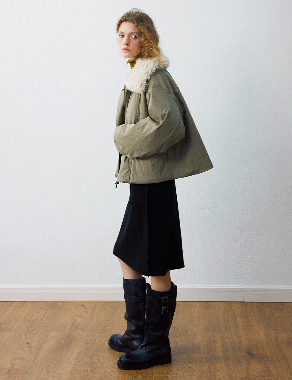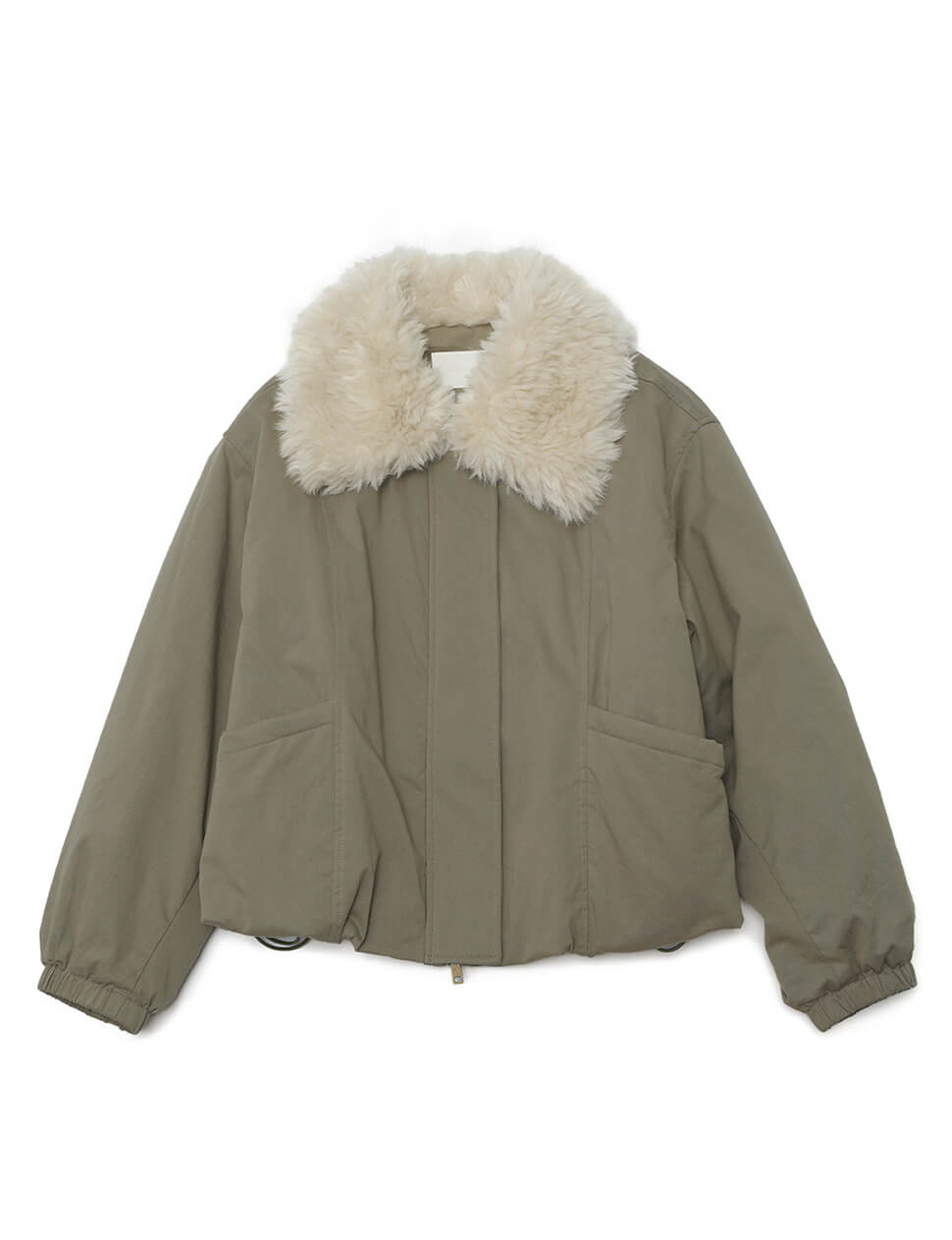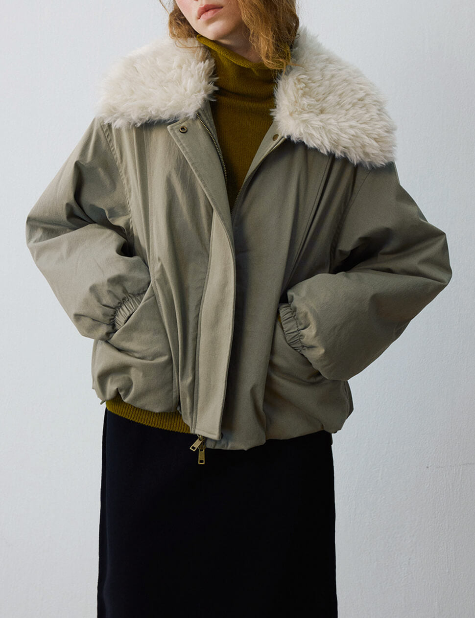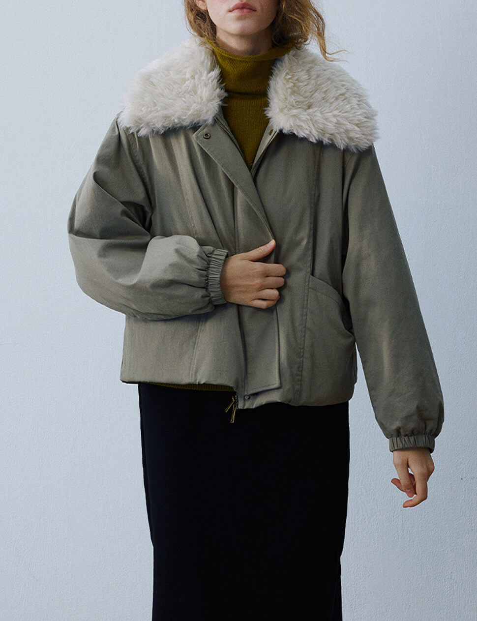 Our pre-order allows us to produce on demand, minimizing waste.Green crop bomber jacket with faux fur collar