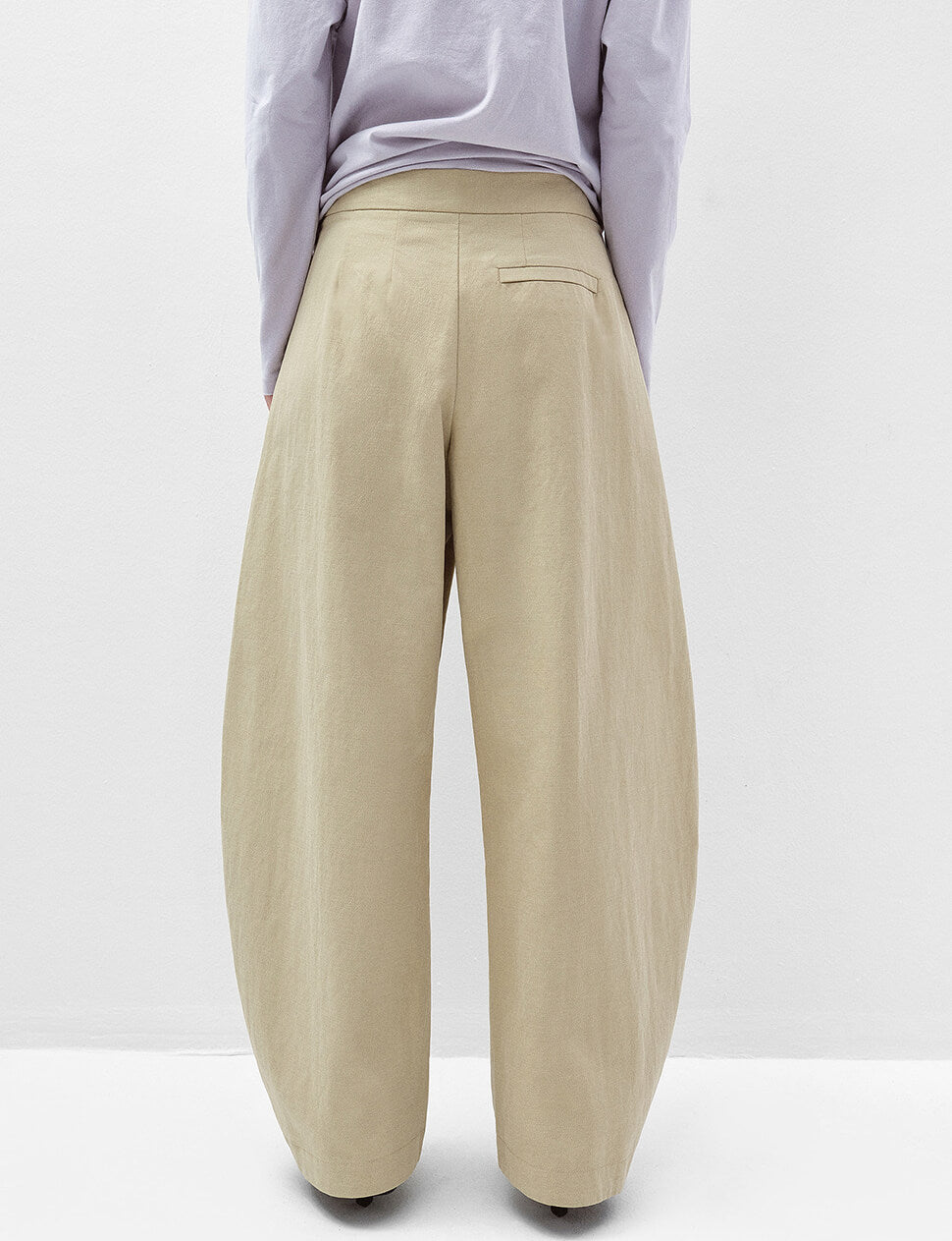 The tan pants that go with everything but look like nothing else. Our High Waist Barrel Leg Pants in black are cut from a lightweight cotton lyocell blend with deep front pleats and a rounded barrel leg that tapers at the ankle. The kind of piece that makes your whole wardrobe feel more intentional. Also available in white and black