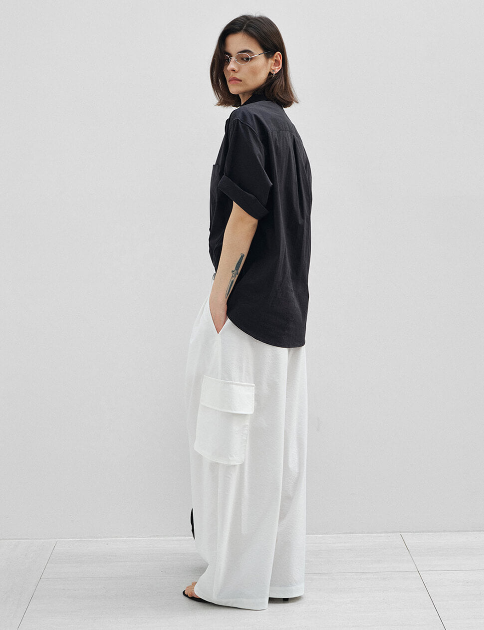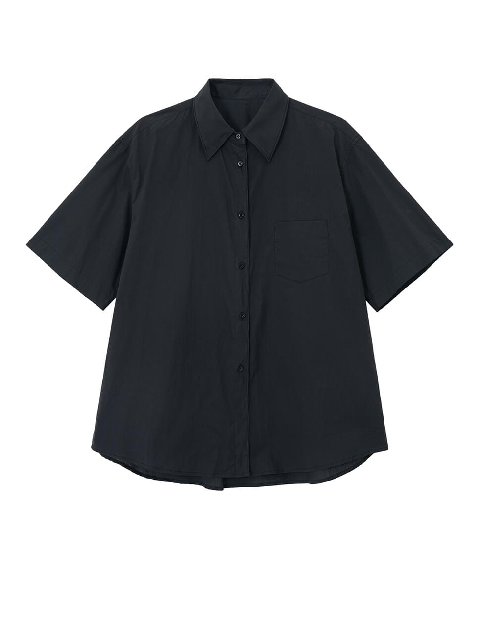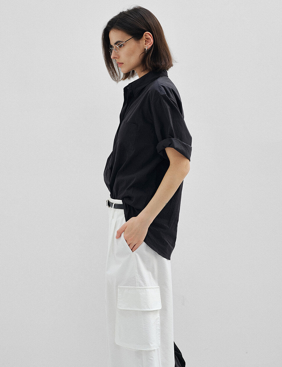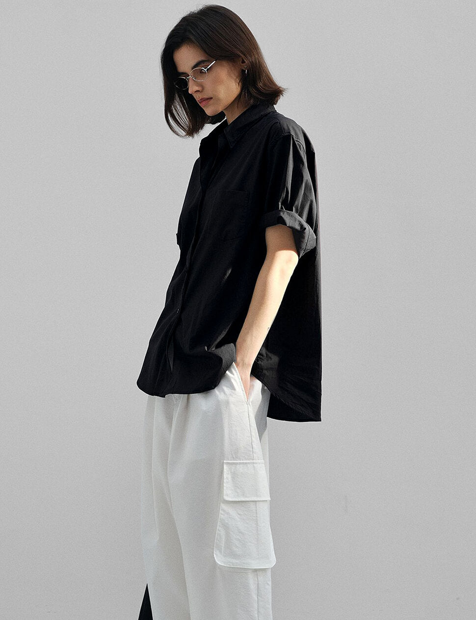 We produce on demand-once it's gone, it's gone.The black shirt, perfected. Our Relaxed Short Sleeve Button Down is cut from crisp 100% cotton in a slightly oversized silhouette that works as hard as you need it to. A classic point collar, single chest pocket and curved hem keep it clean and considered — tuck it into tailored shorts, leave it loose over a slip skirt, or knot it at the waist.