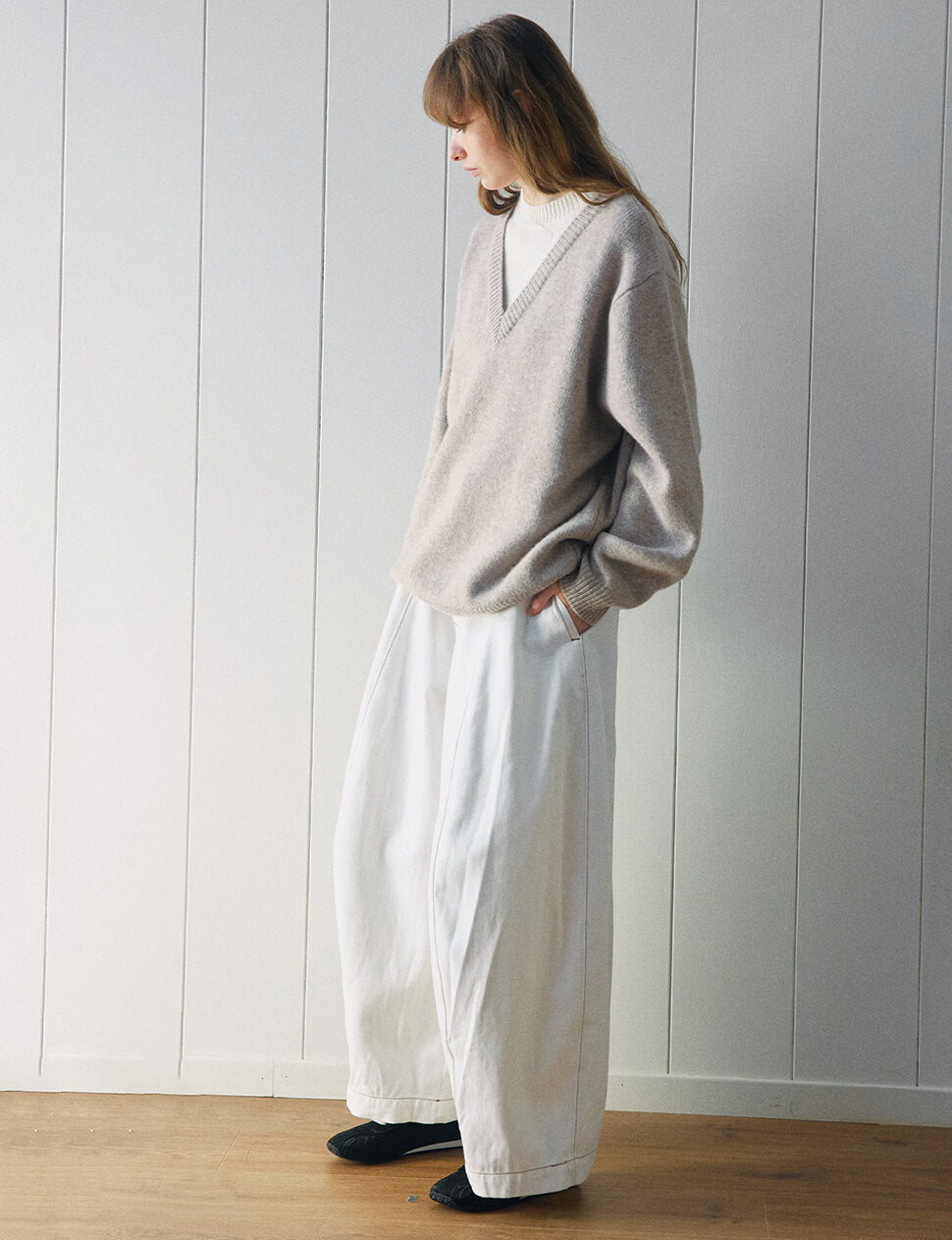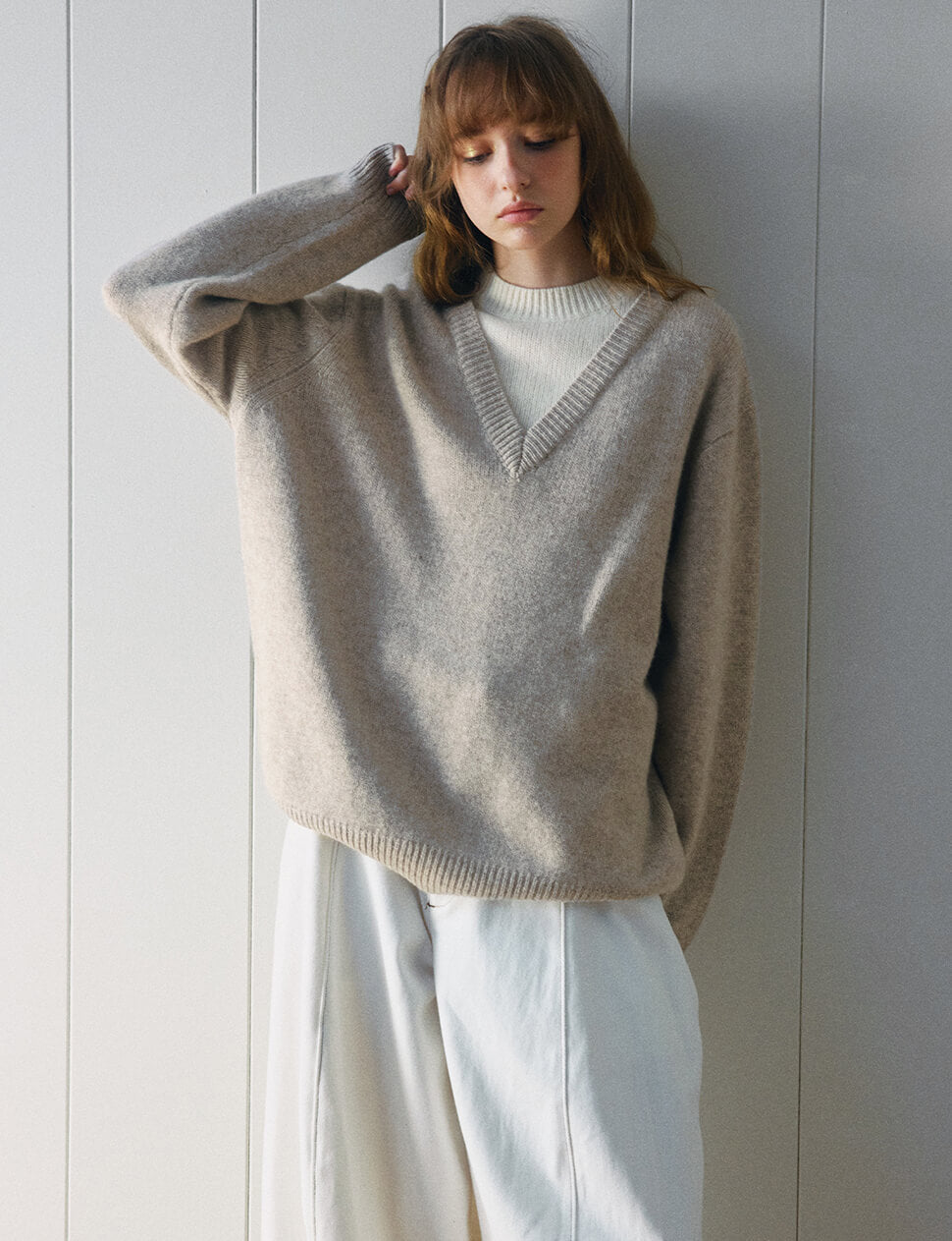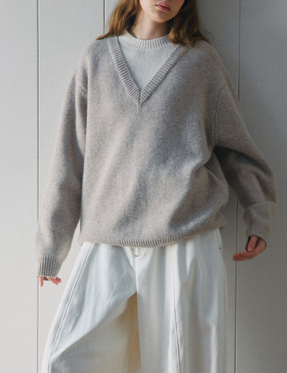 Our pre-order allows us to produce on demand, minimizing waste.Two-tone contrast V neck sweater