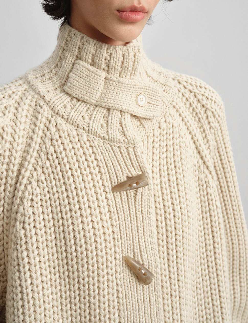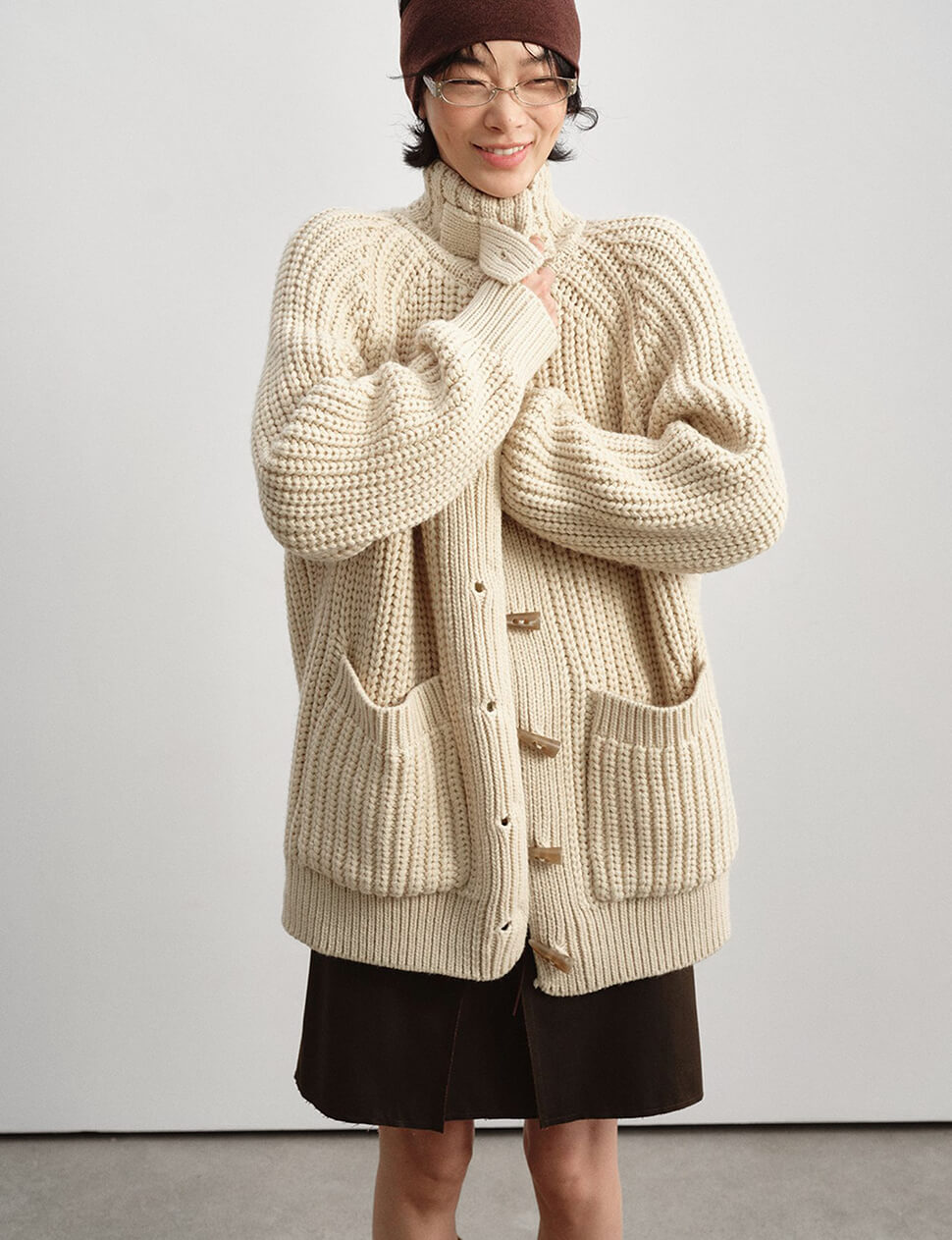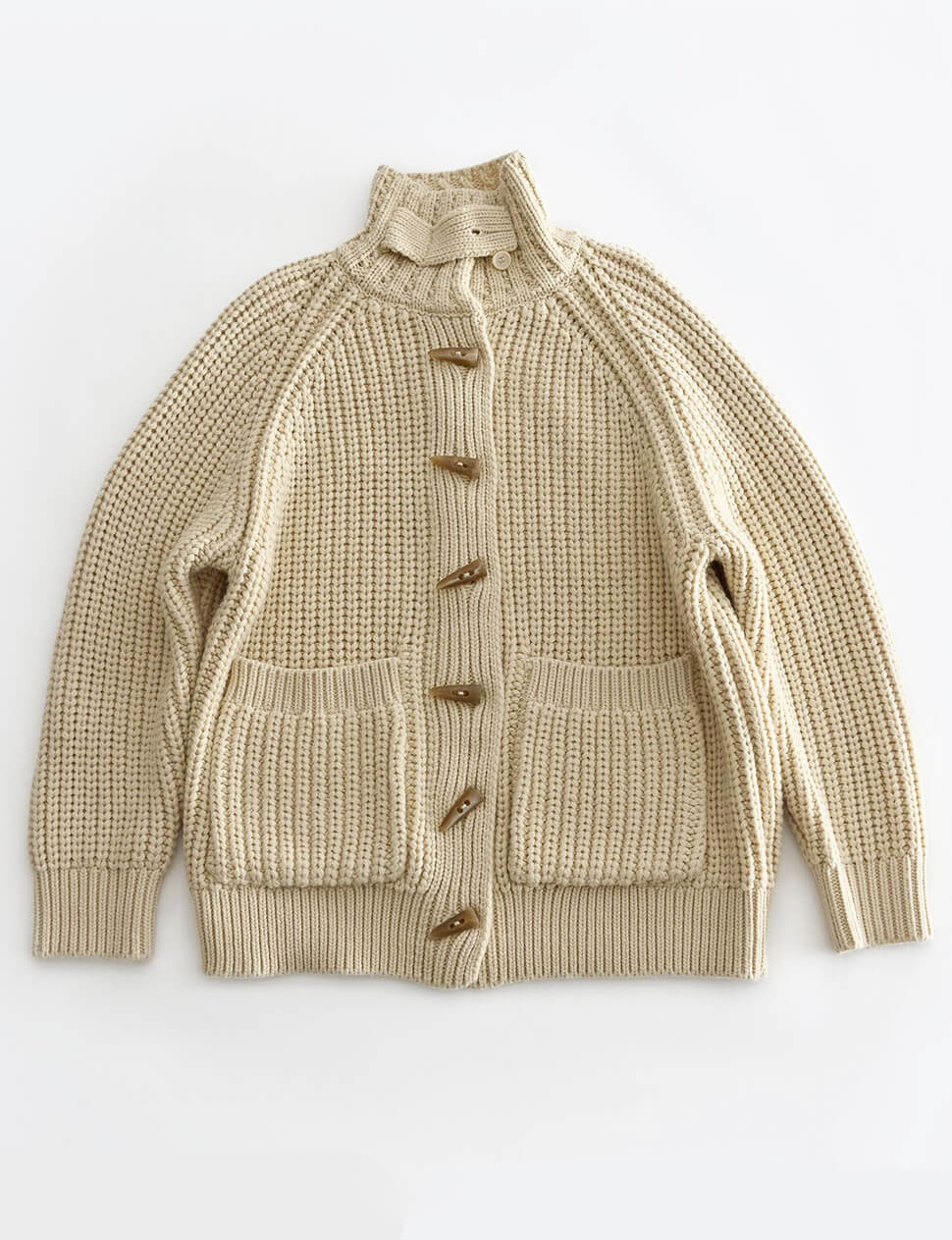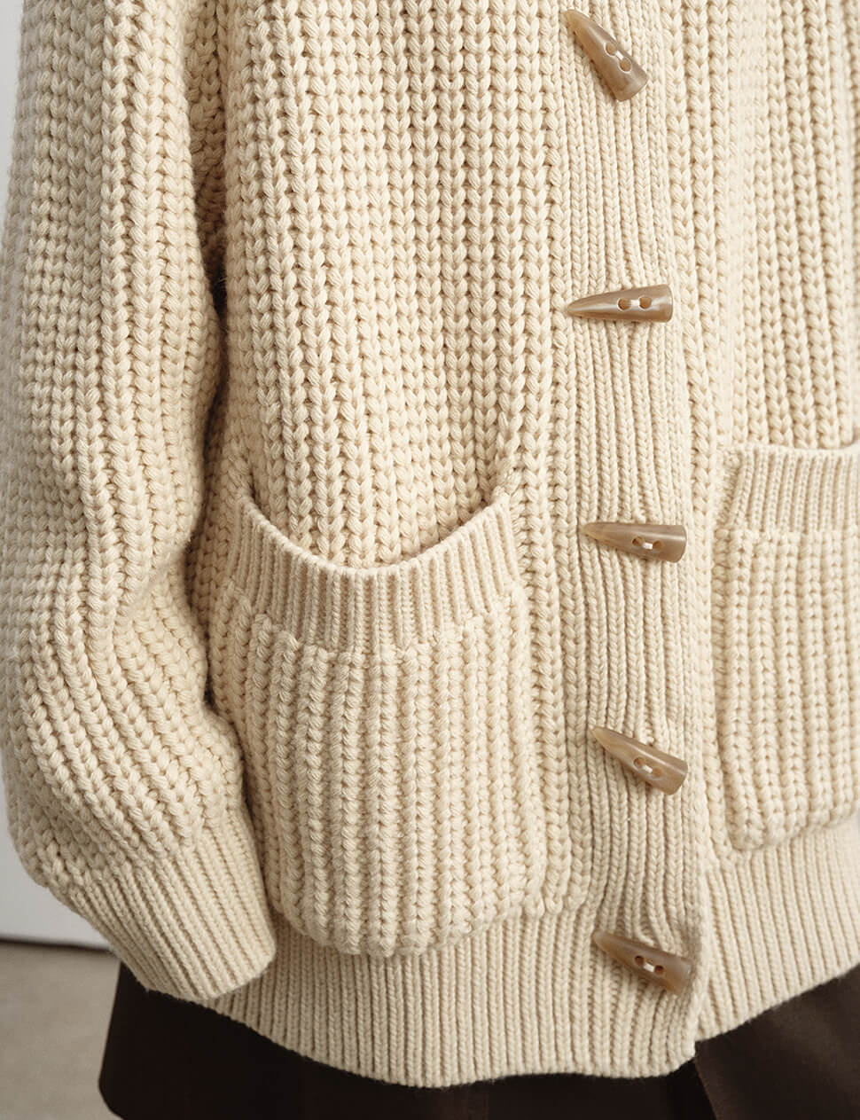 Our pre-order allows us to produce on demand, minimizing waste.Chunky oversized cardigan with horn-hook button closure