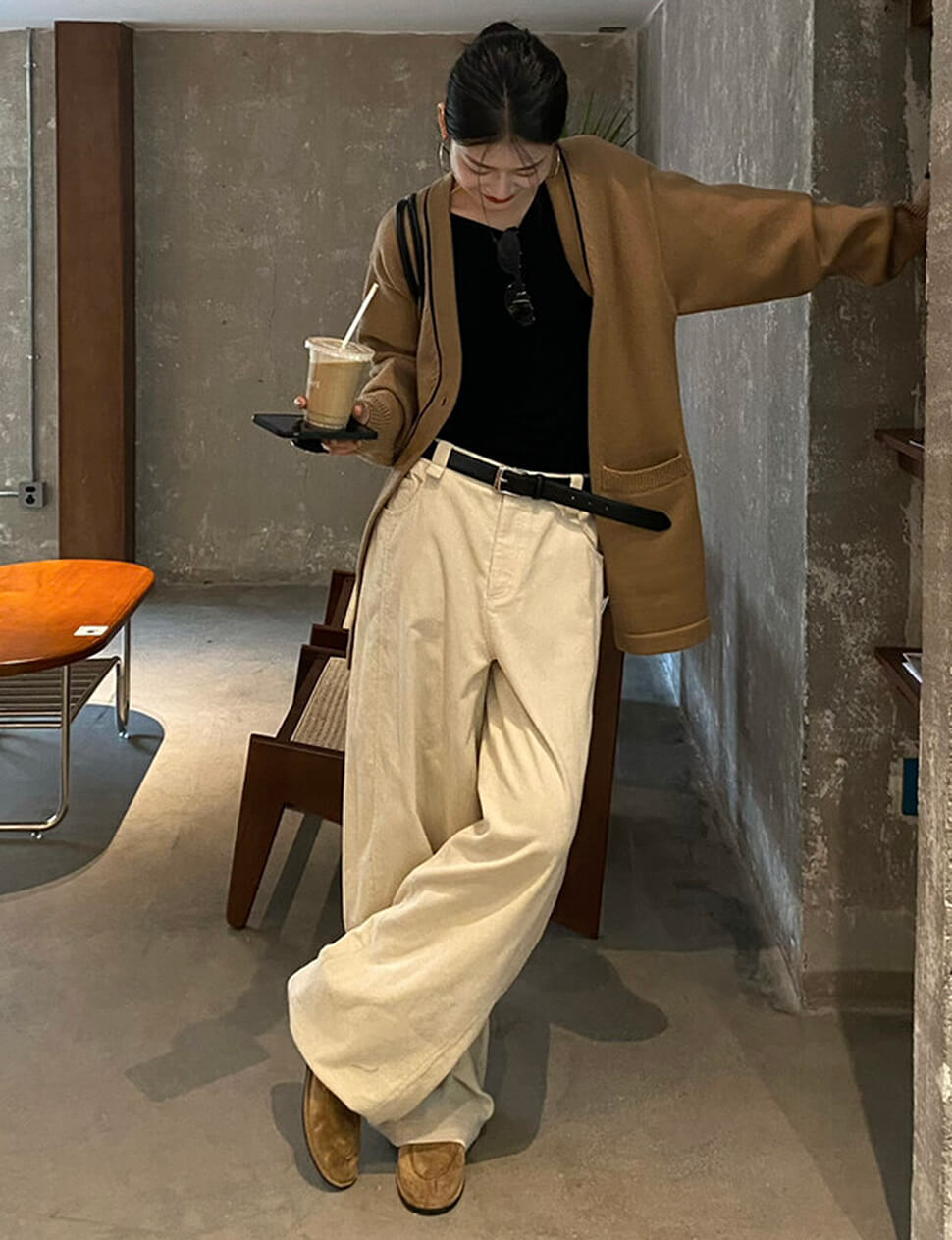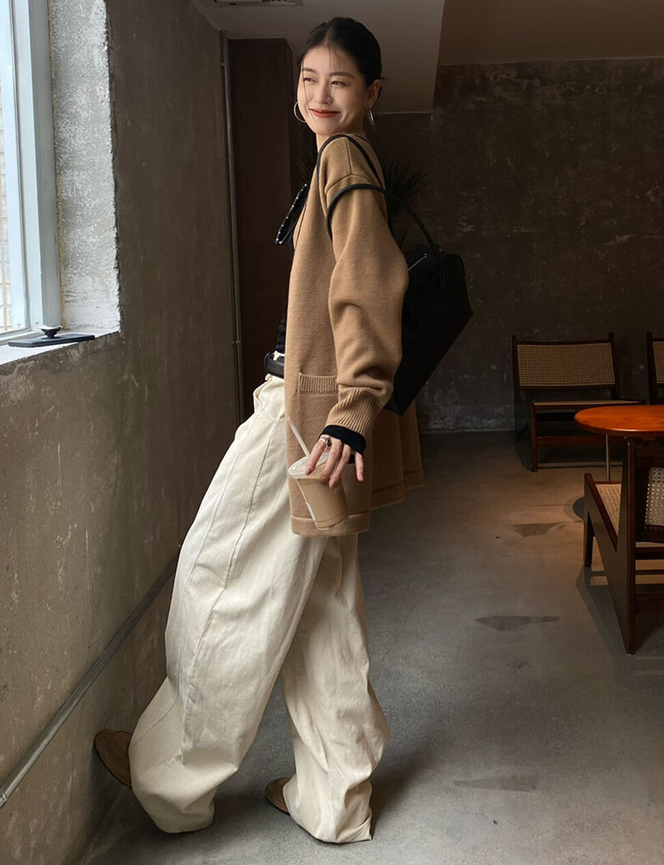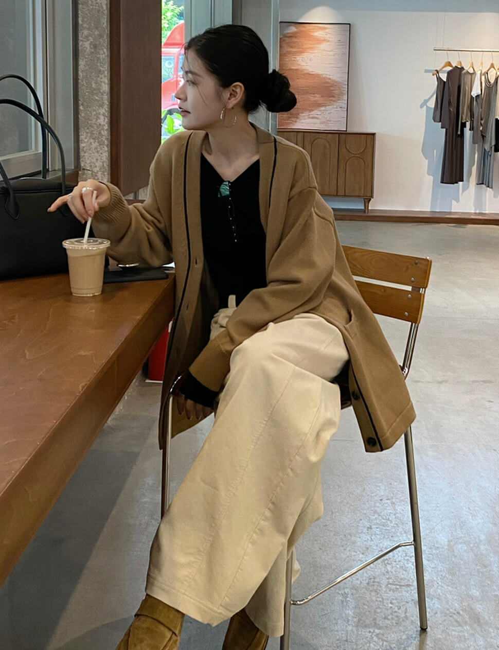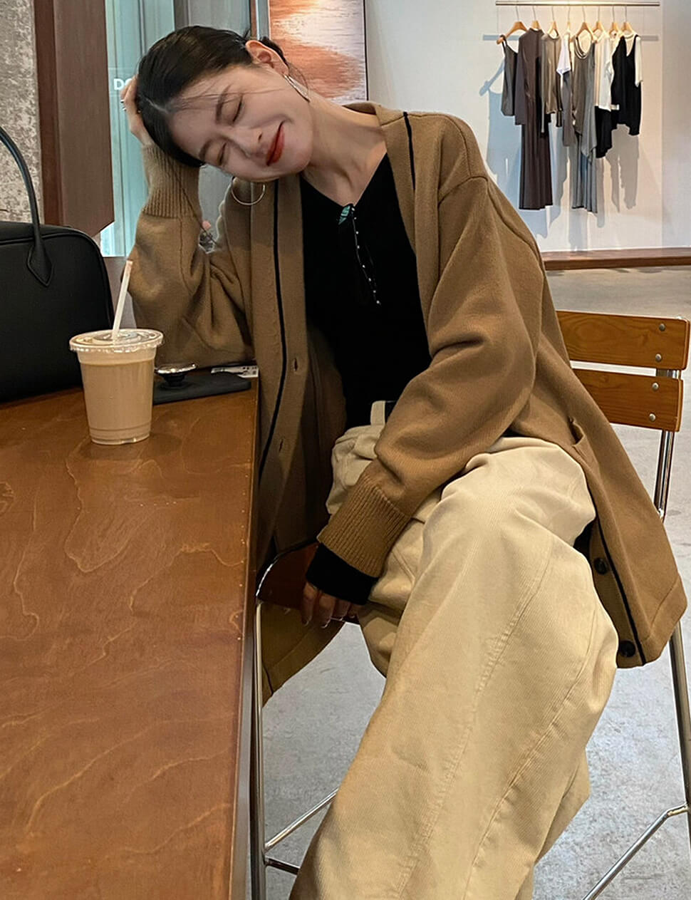 Our pre-order allows us to produce on demand, minimizing waste.Long tan knit cardigan with black contrast piping.