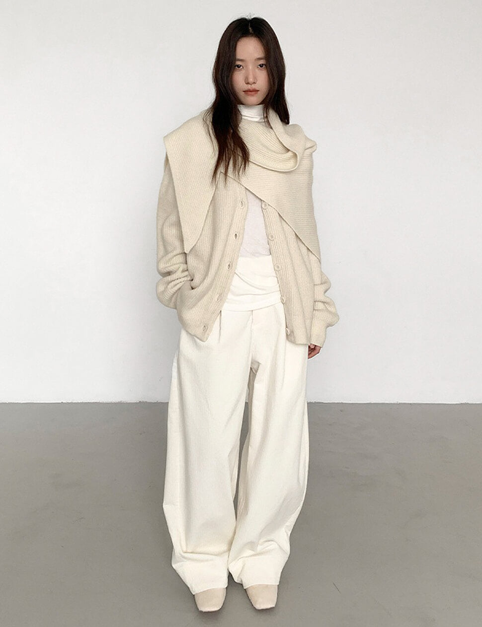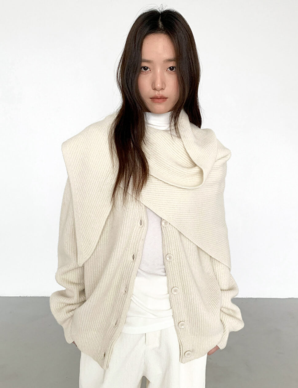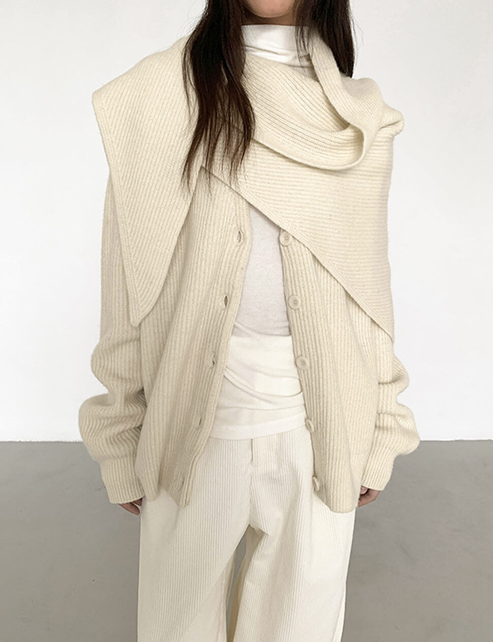 Our pre-order allows us to produce on demand, minimizing waste.Ivory knit cardigan with separate knit matching scarf