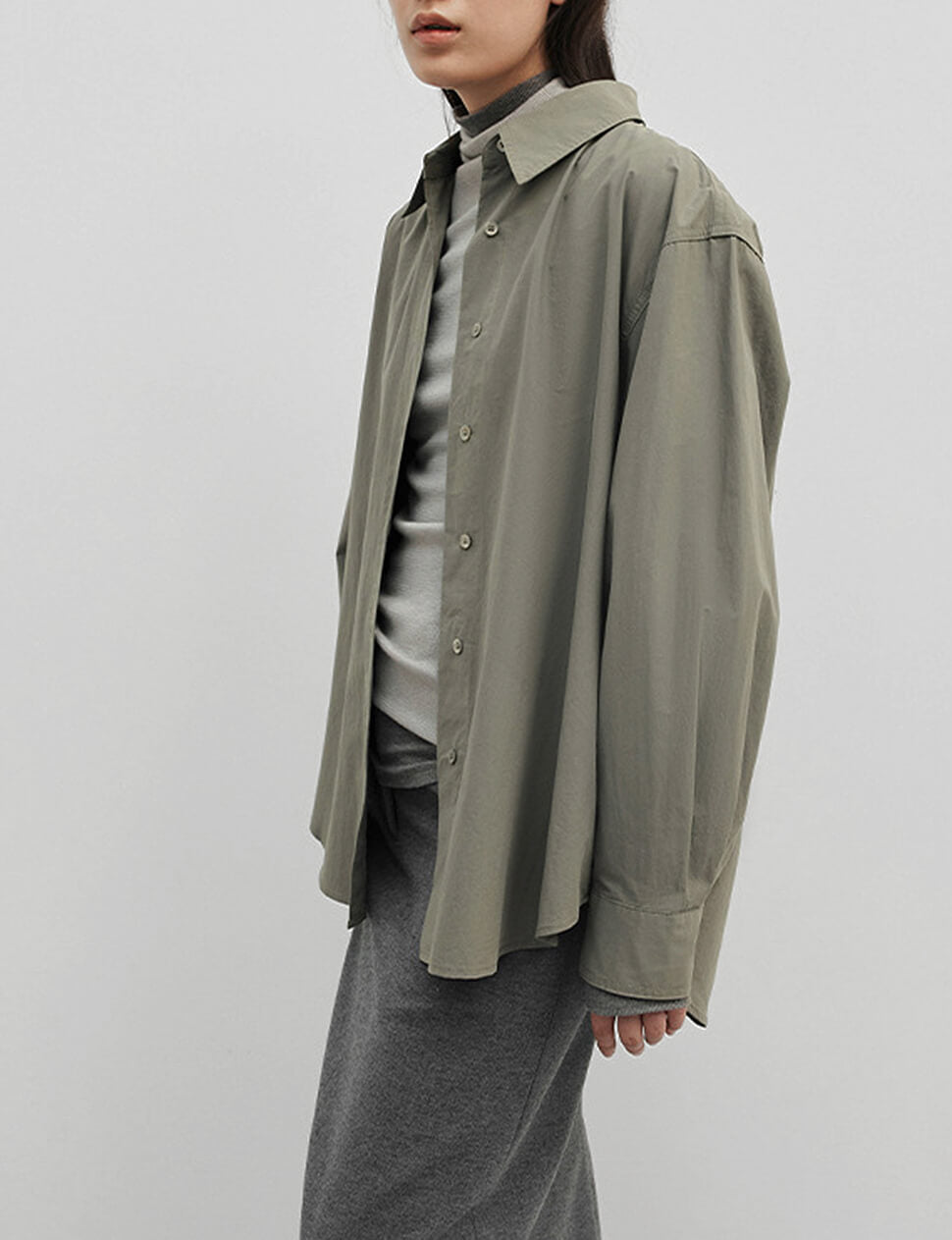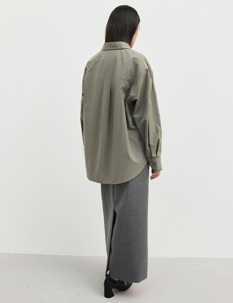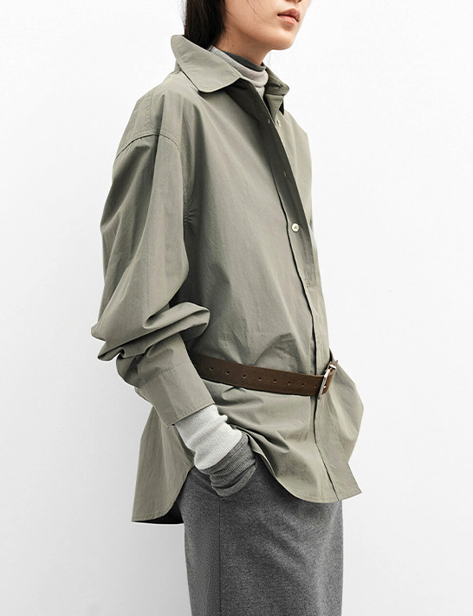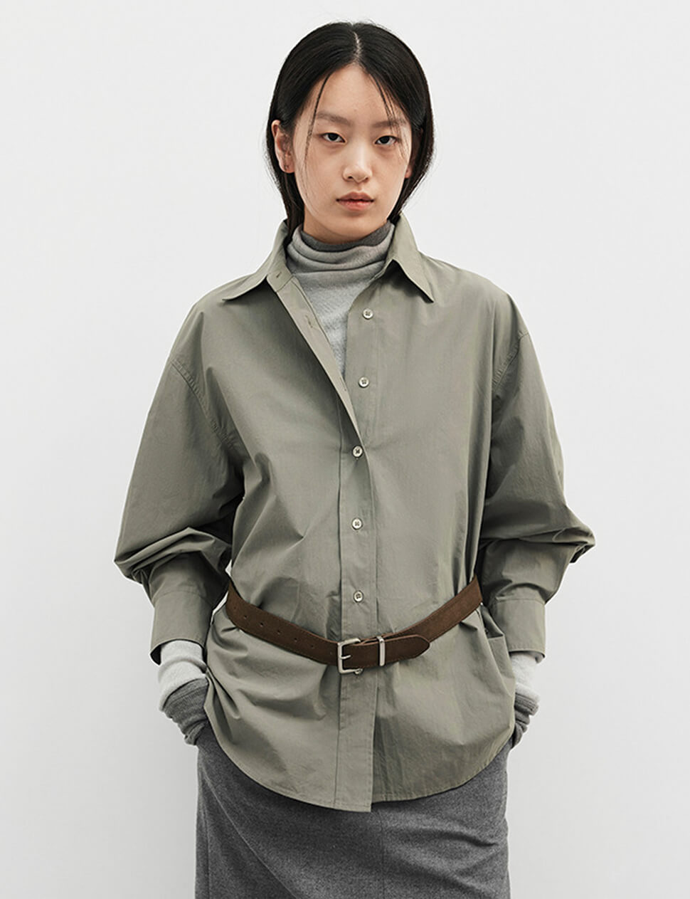Our pre-order allows us to produce on demand, minimizing waste.Grey-khaki shirt with detached belt