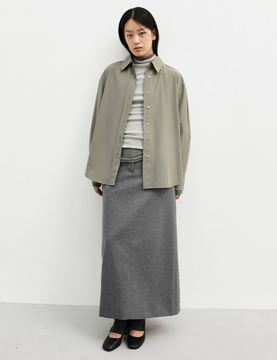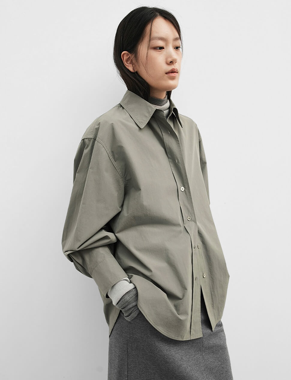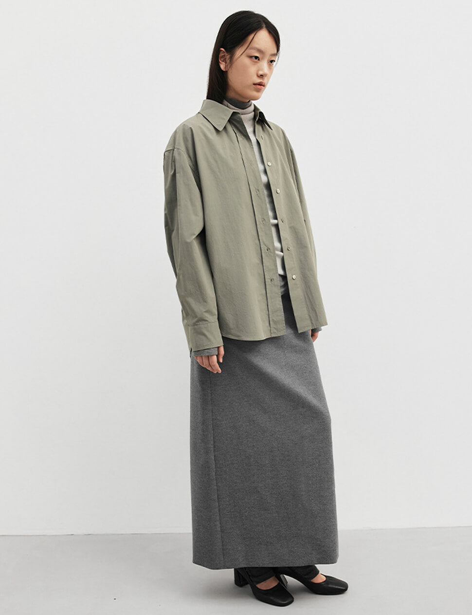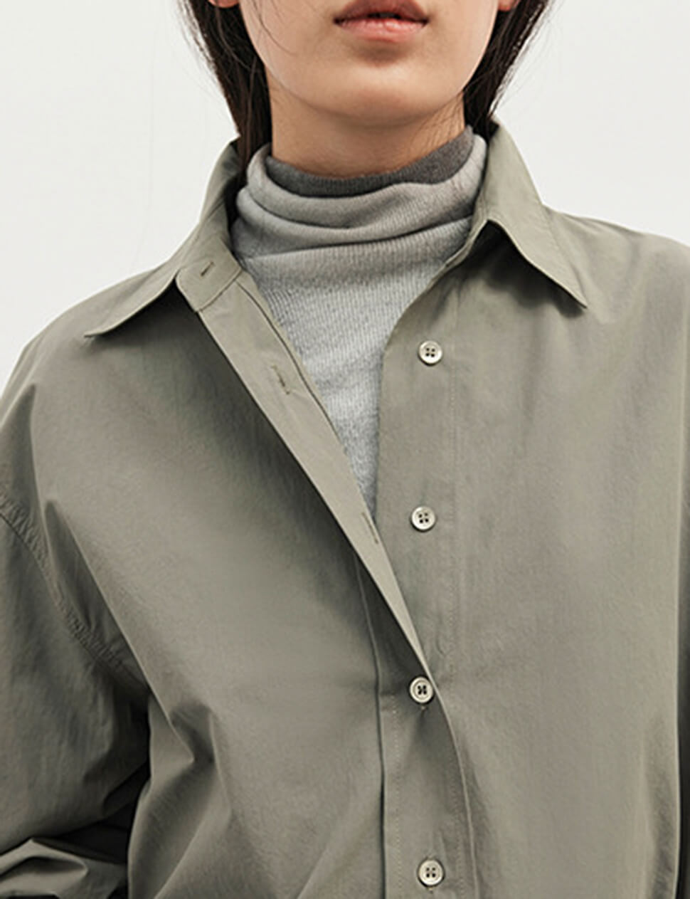 Our pre-order allows us to produce on demand, minimizing waste.Grey-khaki shirt with detached belt