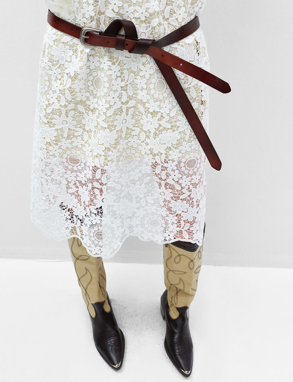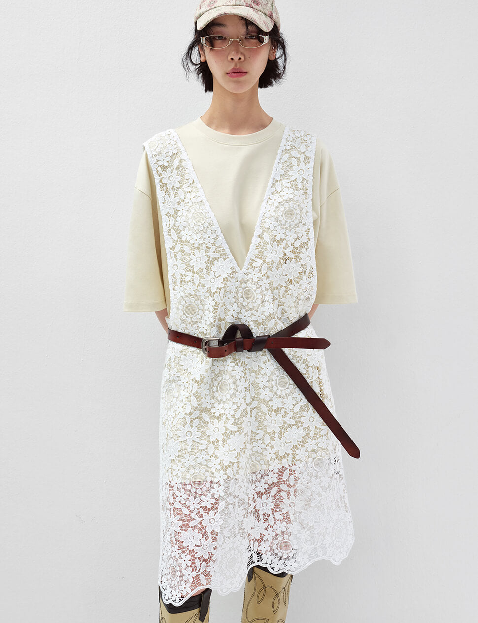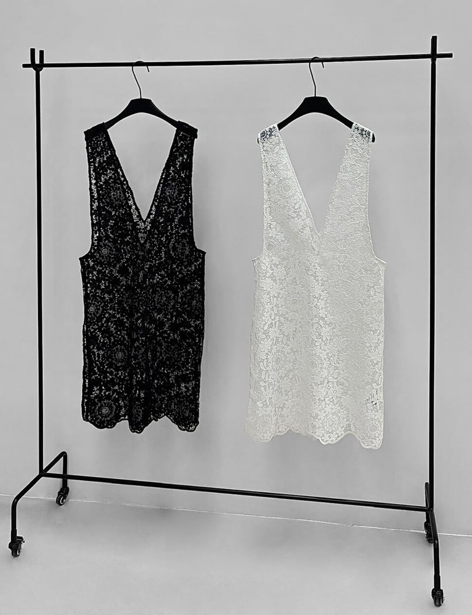 The white lace piece your spring wardrobe needs. Our Floral Lace Tank Dress in black is cut from sheer floral lace with a deep V neck and sleeveless silhouette. Wear it as a dress over a slip or layer it over a crisp white shirt for a striking contrast — one of the most talked about styling moves of the season. Belt it at the waist or let it drape loose. Also available in black