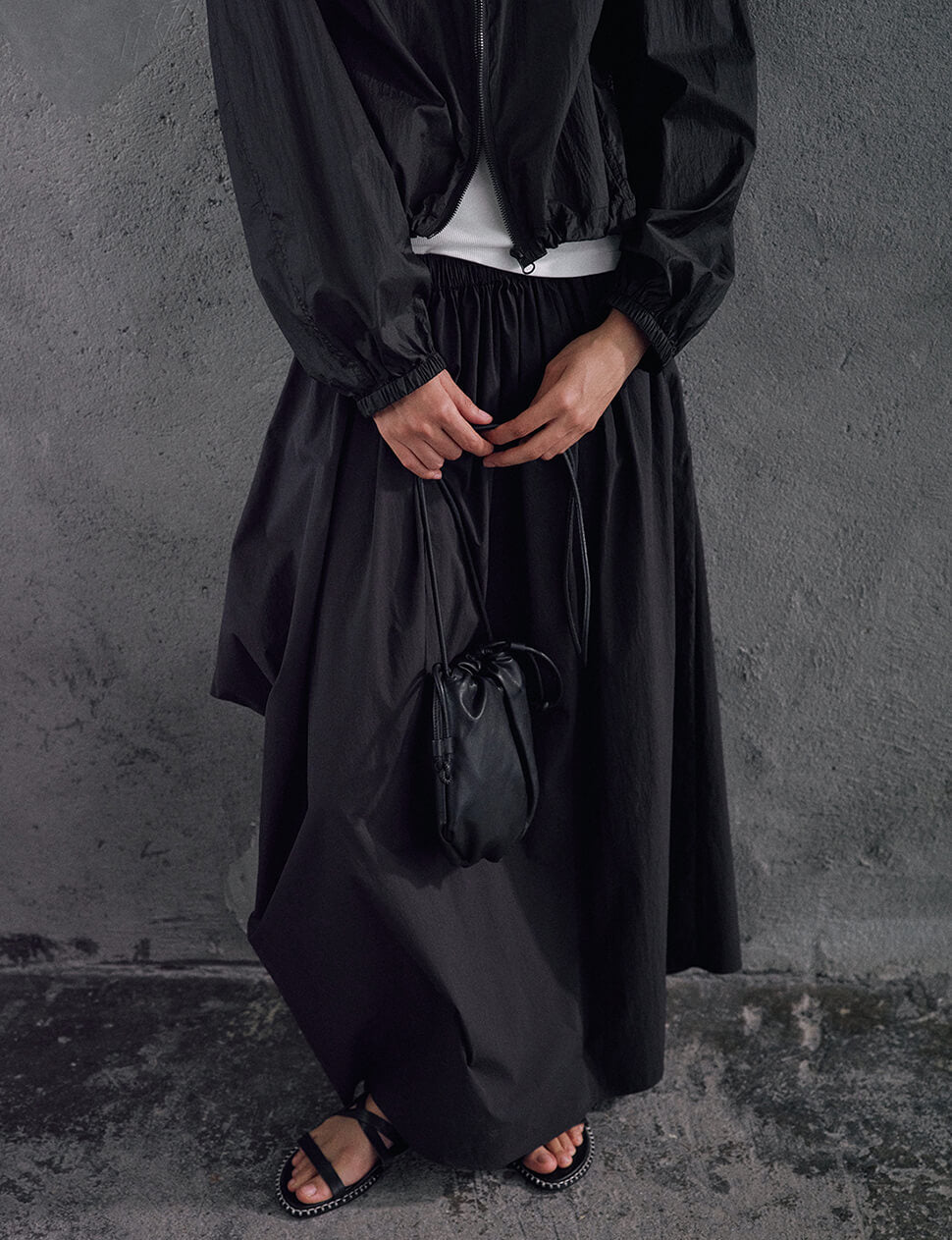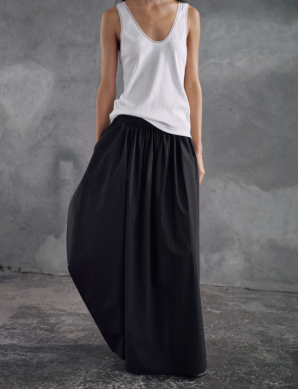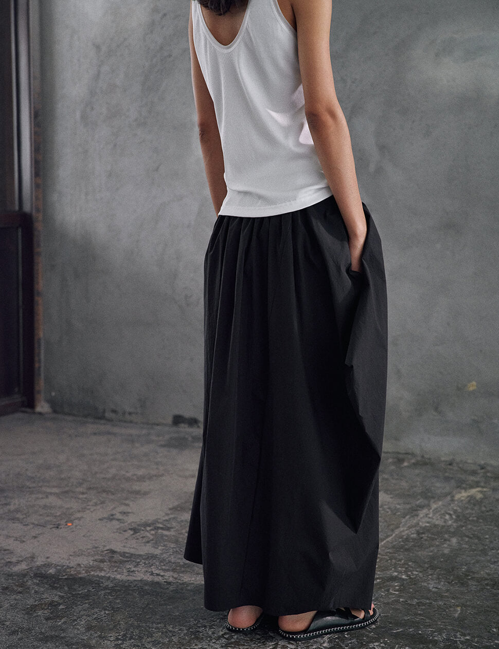 We produce on demand-once it's gone, it's gone.Some skirts drape. This one takes up space. Cut from a crisp cotton-nylon blend in an asymmetric cocoon silhouette, it balloons away from the body with a gathered waist and a hem that dips longer at the back — structured enough to hold its shape, light enough to move. The fabric has a subtle texture that reads sculptural in person and effortless in motion. Wear it with a fitted tank tucked or tied at the waist. Available in White, Black, and Light Cloud Gray.