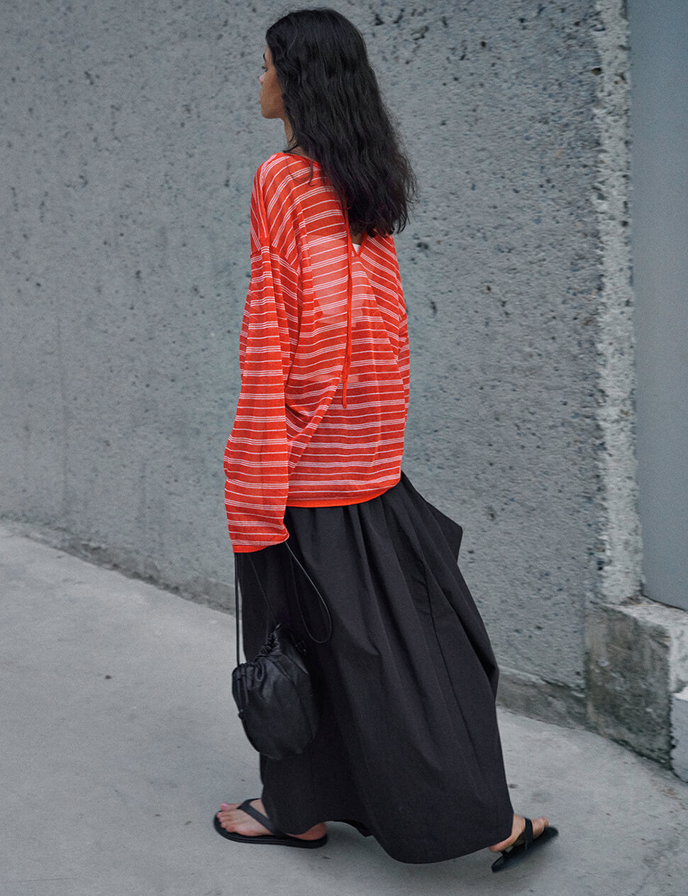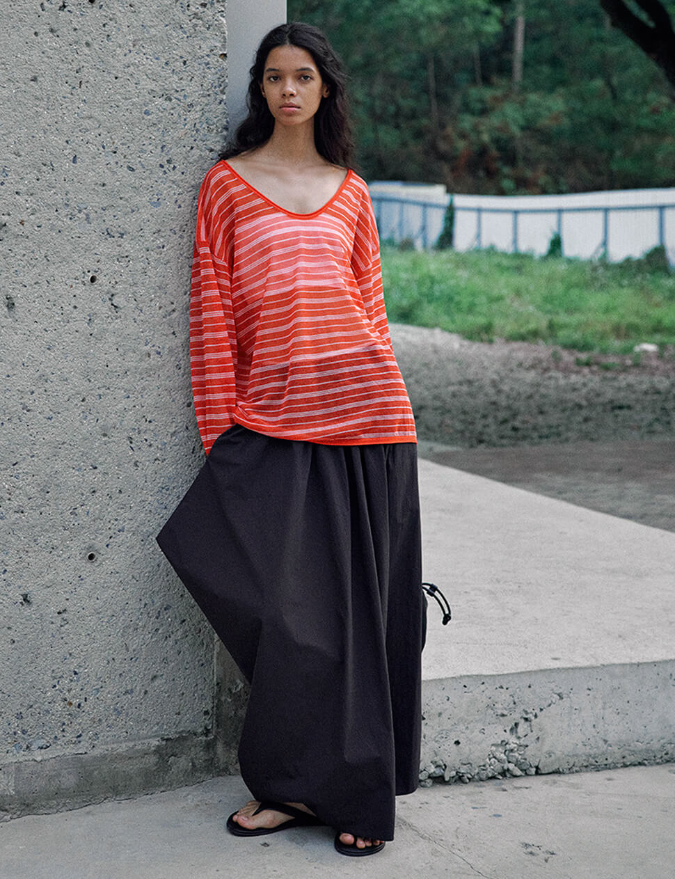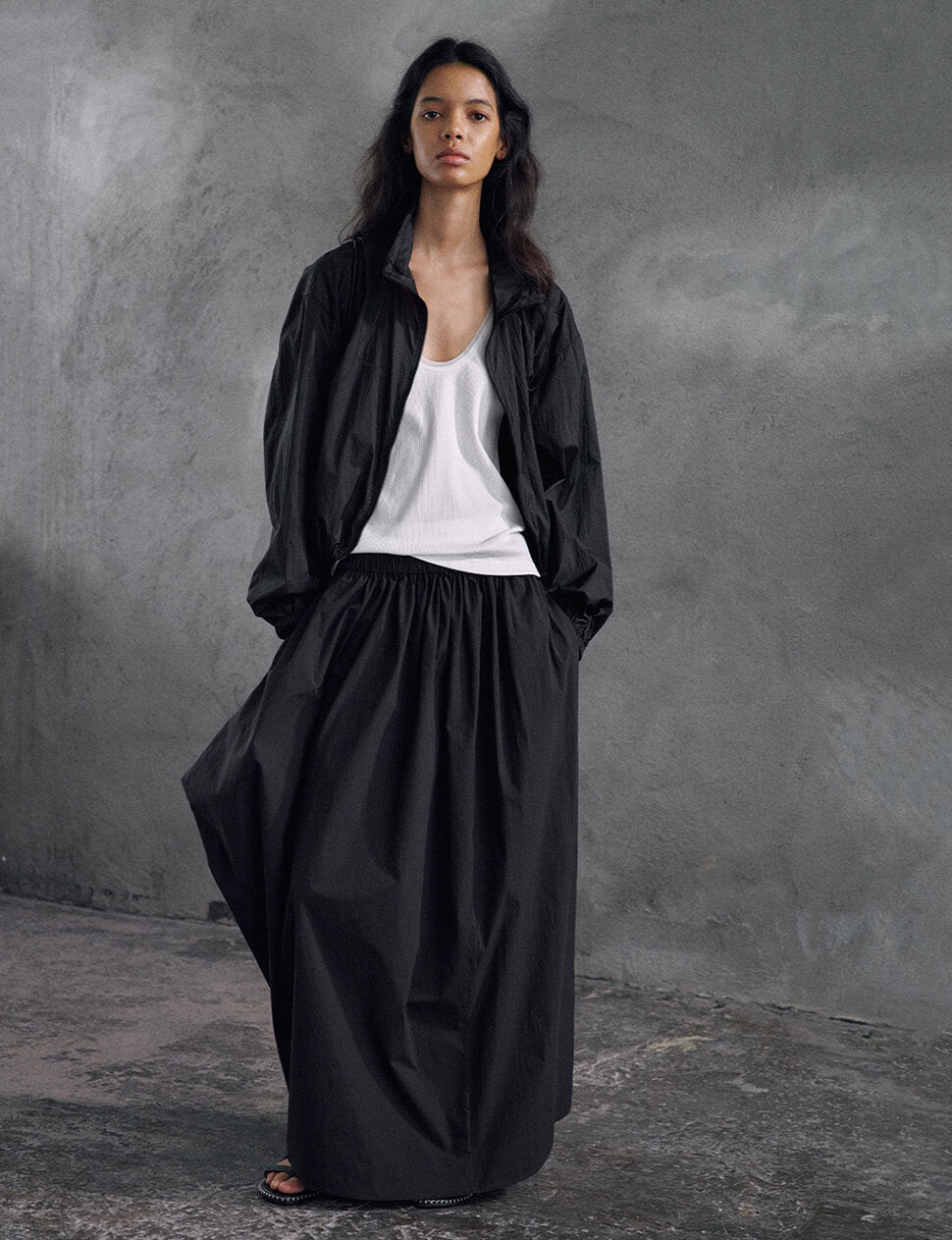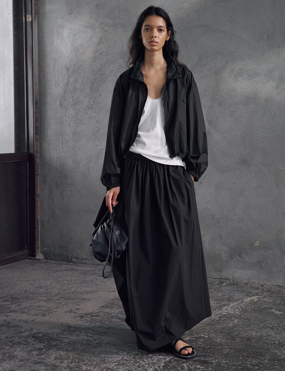 We produce on demand-once it's gone, it's gone.Some skirts drape. This one takes up space. Cut from a crisp cotton-nylon blend in an asymmetric cocoon silhouette, it balloons away from the body with a gathered waist and a hem that dips longer at the back — structured enough to hold its shape, light enough to move. The fabric has a subtle texture that reads sculptural in person and effortless in motion. Wear it with a fitted tank tucked or tied at the waist. Available in White, Black, and Light Cloud Gray.