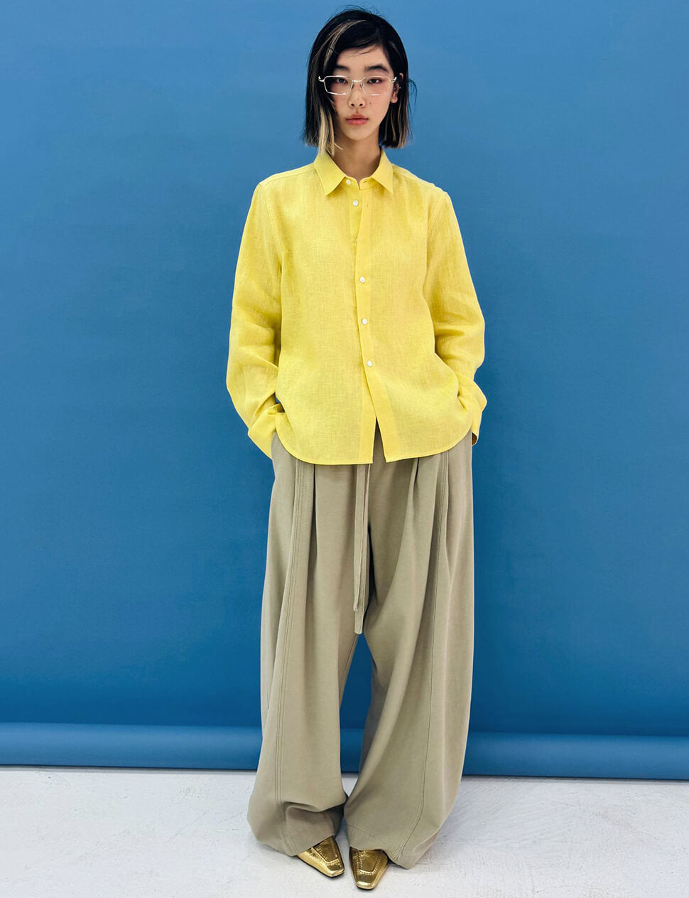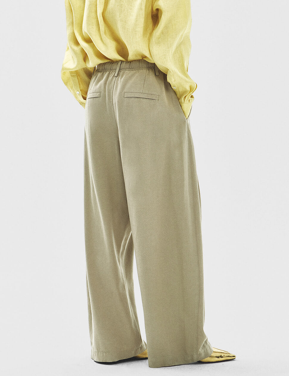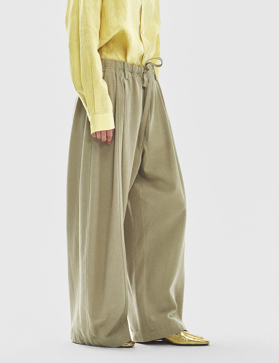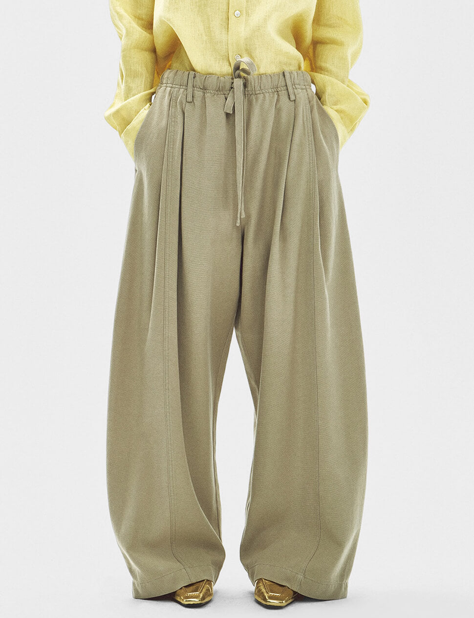 Cut with a relaxed wide leg and deep pleats that fall into generous, sculptural folds, these are the trousers you reach for when you want to feel unhurried. The elastic drawstring waist sits comfortably without sacrificing the tailored impression — side pockets sit flush, back welt pockets keep the silhouette clean. Made from a lyocell-cotton blend that has just enough weight to drape well without clinging. Wear them with a fitted tank and flats, or tucked under an oversized linen shirt.
