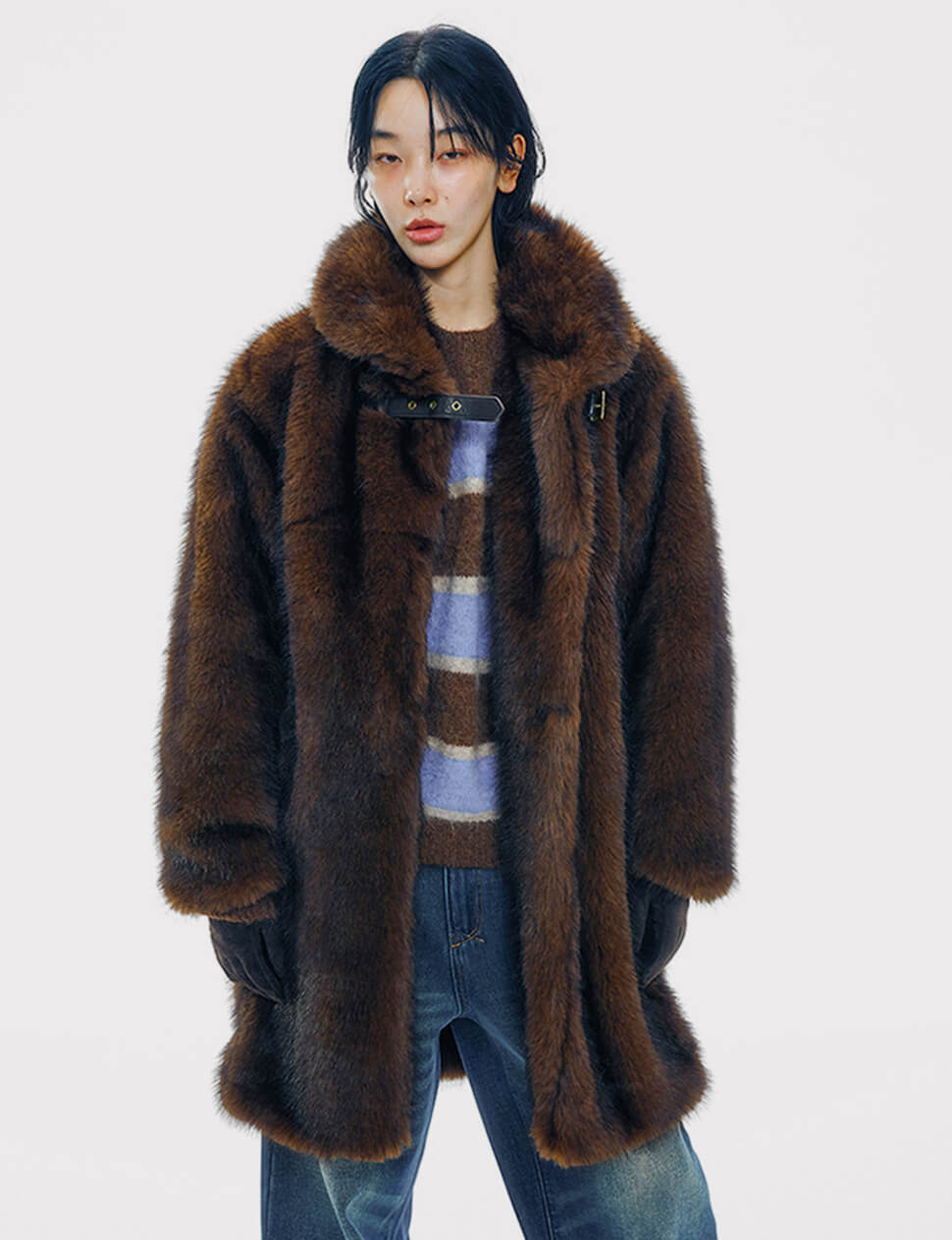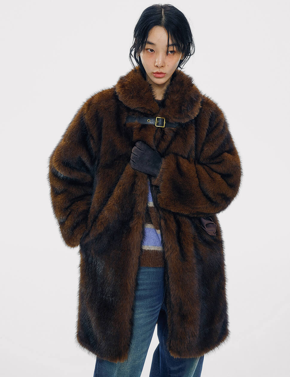 Our pre-order allows us to produce on demand, minimizing waste.Faux Fur Buckled Neck Coat