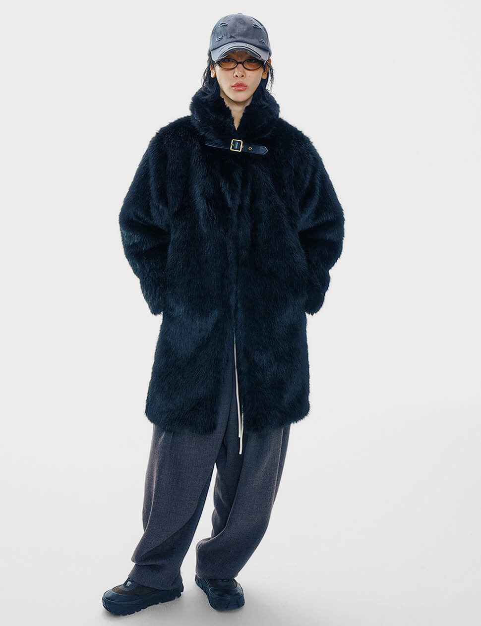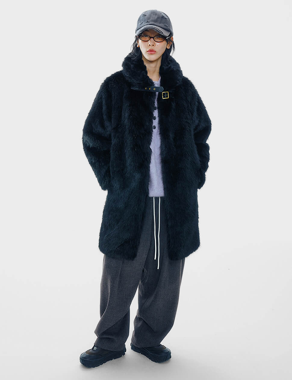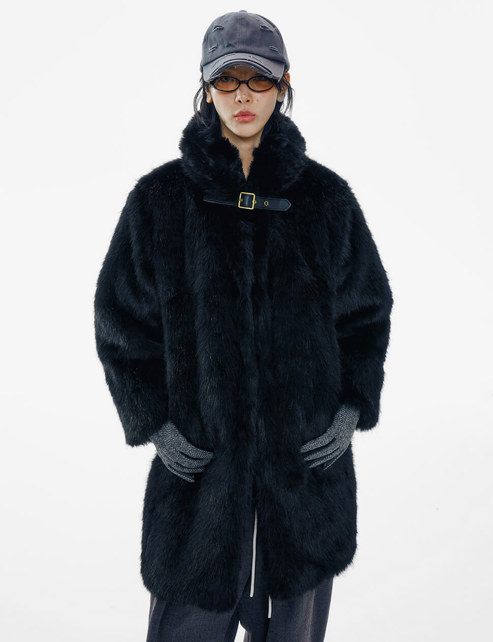 Our pre-order allows us to produce on demand, minimizing waste.Faux Fur Buckled Neck Coat